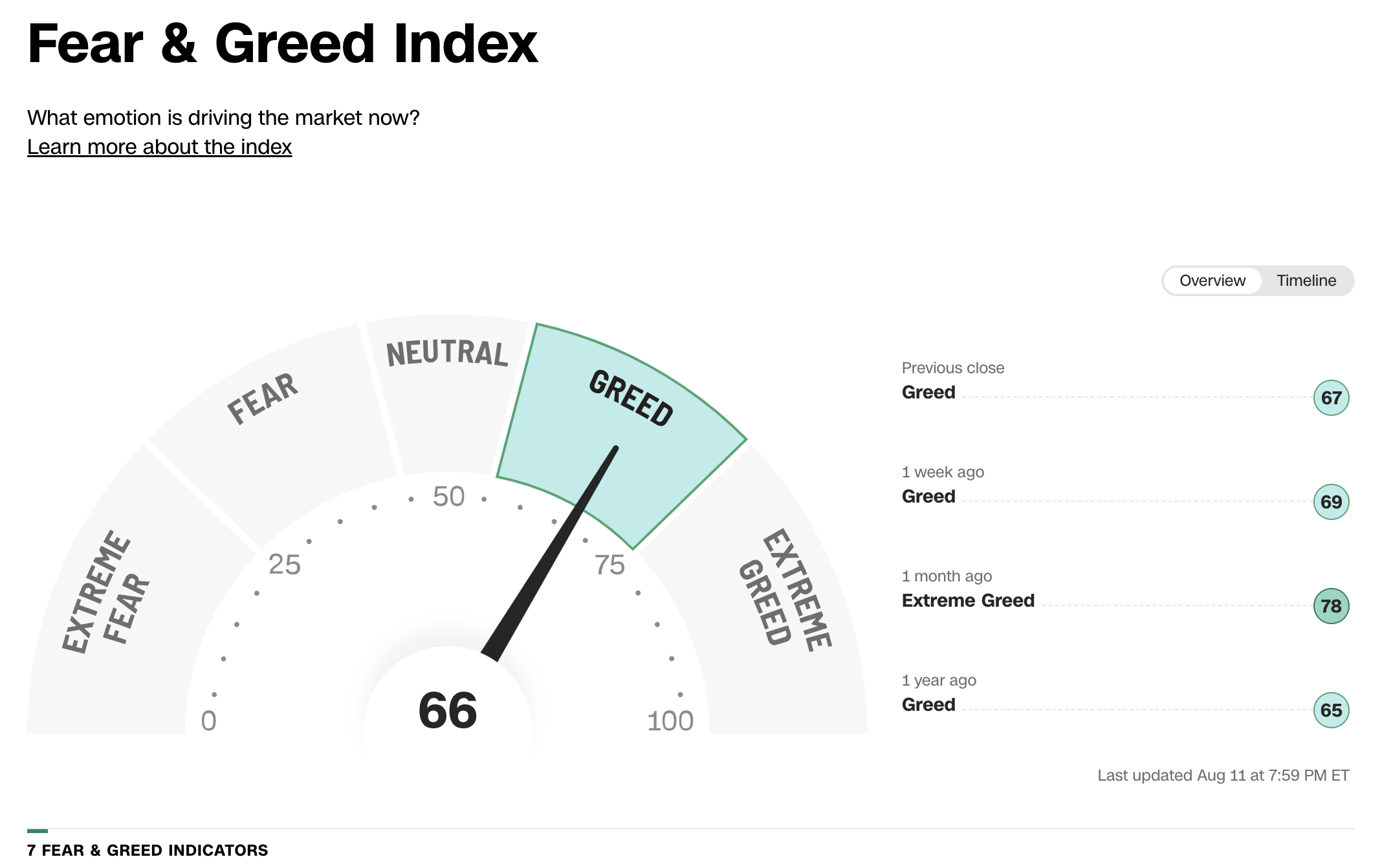 증시 공포와 탐욕지수 2023년 8월 14일 12:30 (자료: CNN 비즈니스)