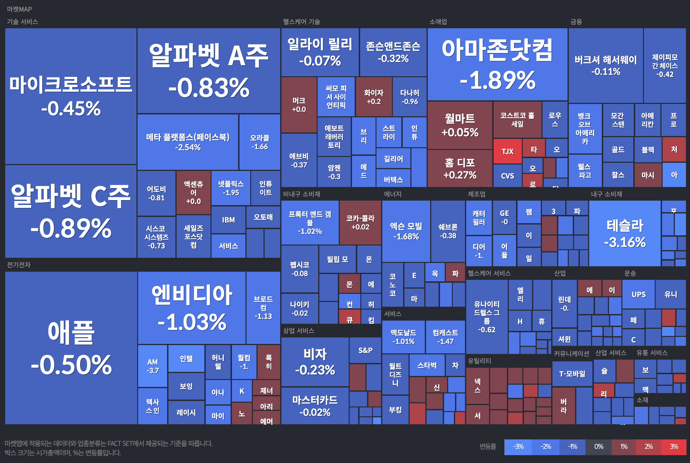 엔비디아는 금리 상승 등을 기반으로 차익 매물이 출되회며 1.03% 하락했다. AMD(-3.74%), 애널로그디바이시스(-2.29%), 마이크론(-1.7%) 등은 하락을 지속했다. 타워 세미컨덕터는 인텔의 인수 제안 철회 소식에 10.69% 급락했다.