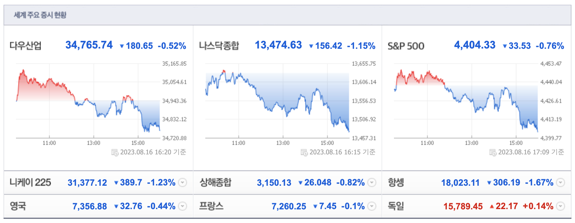 전세계 증시현황과 경제지표 2023년 8월 17일 10:30(자료: 다음금융, 네이버증권)