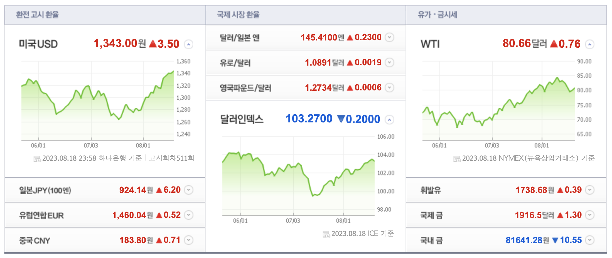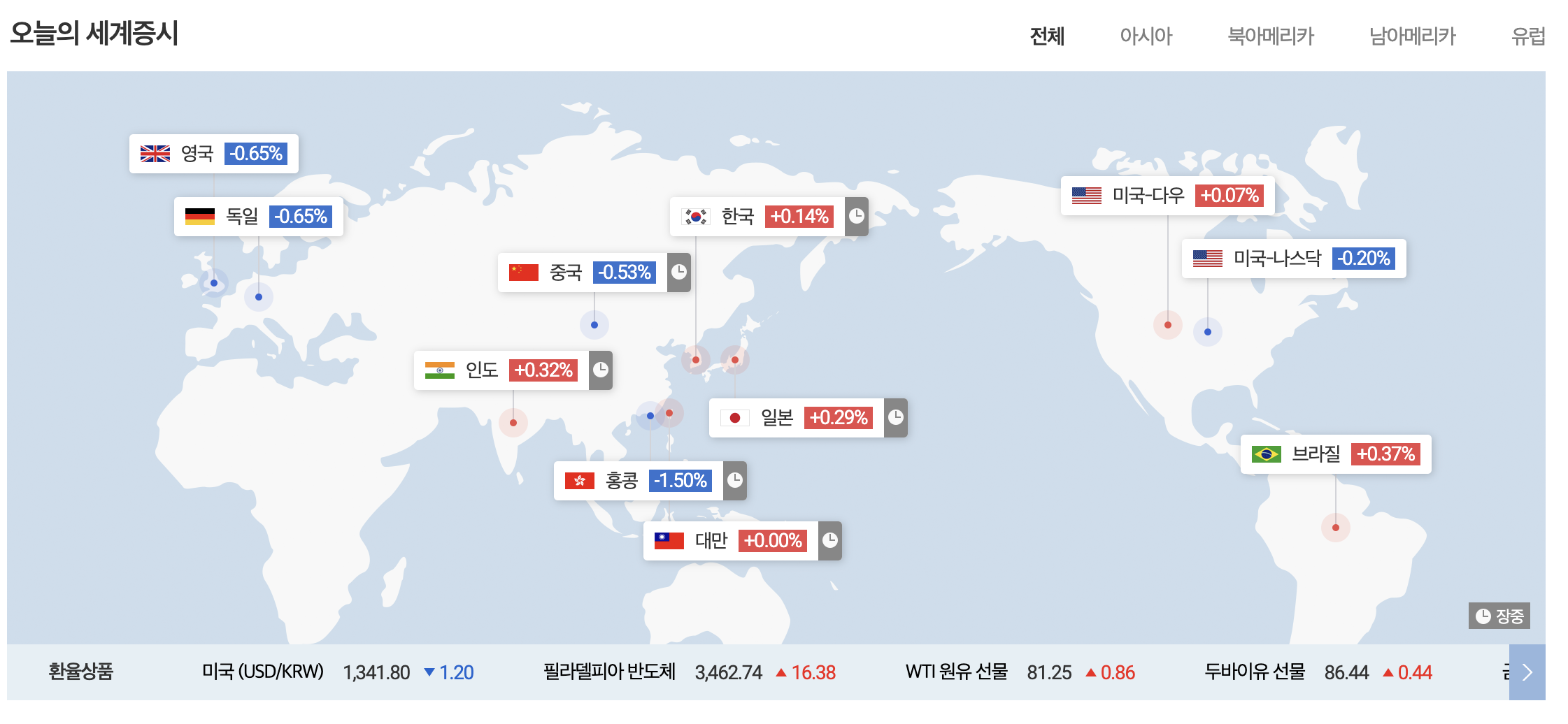 전세계증시 현황 2023년 8월 21일 (자료: 다음금융, 네이버증권)