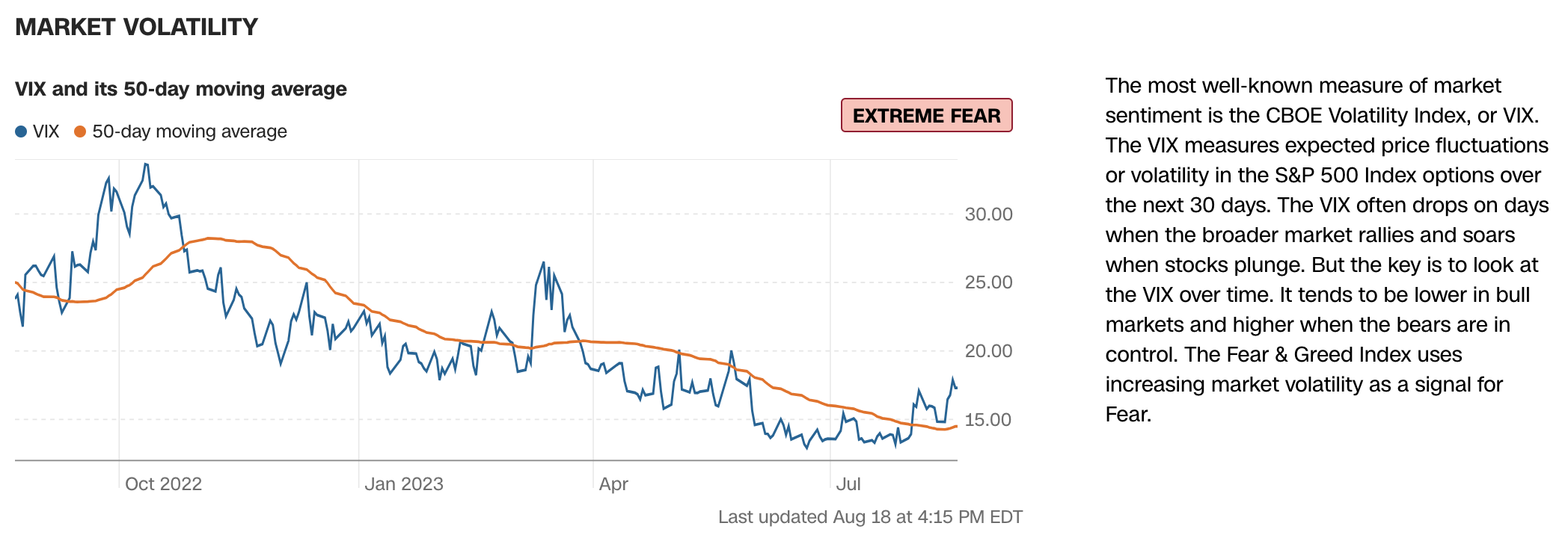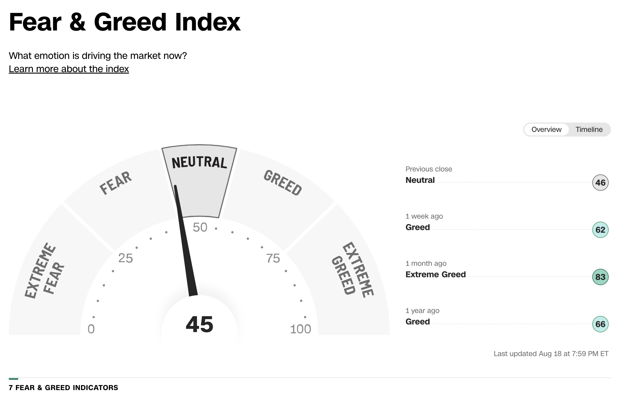 증시 공포와 탐욕지수 2023년 8월 21일 (자료: CNN비즈니스)