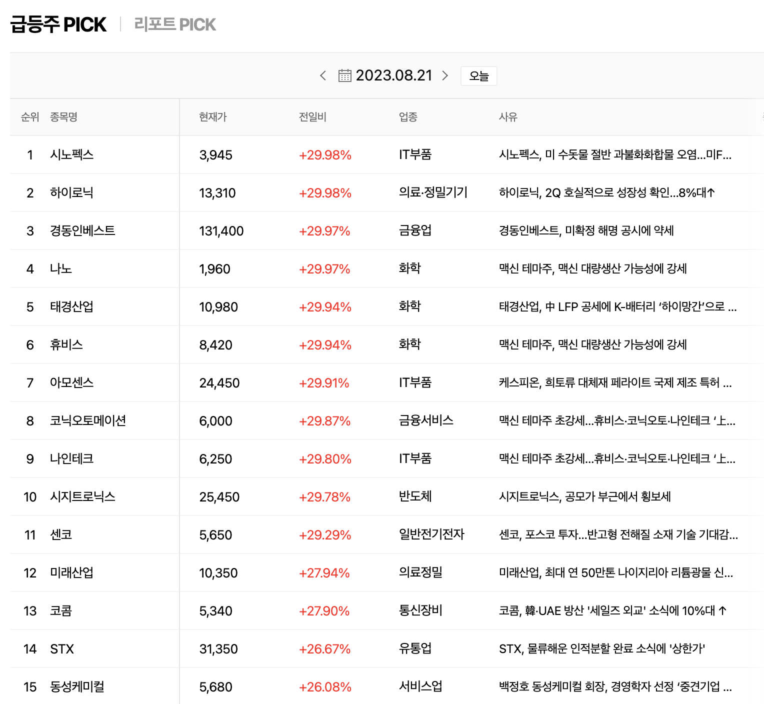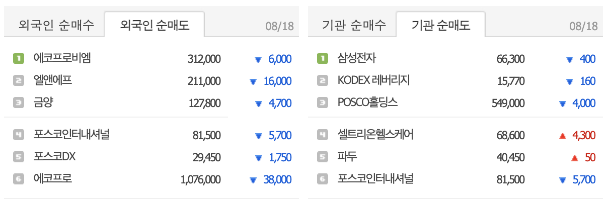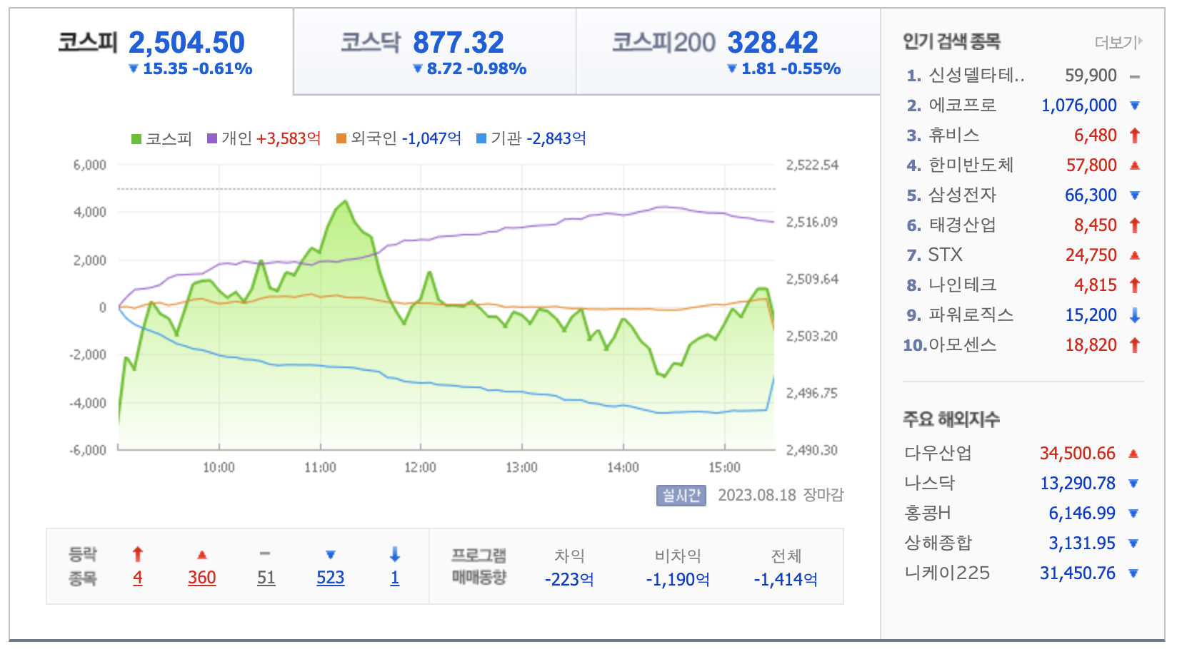 국내 주식시황 현황 2023년 8월 18~21일 (자료: 네이버금융, 줌투자)