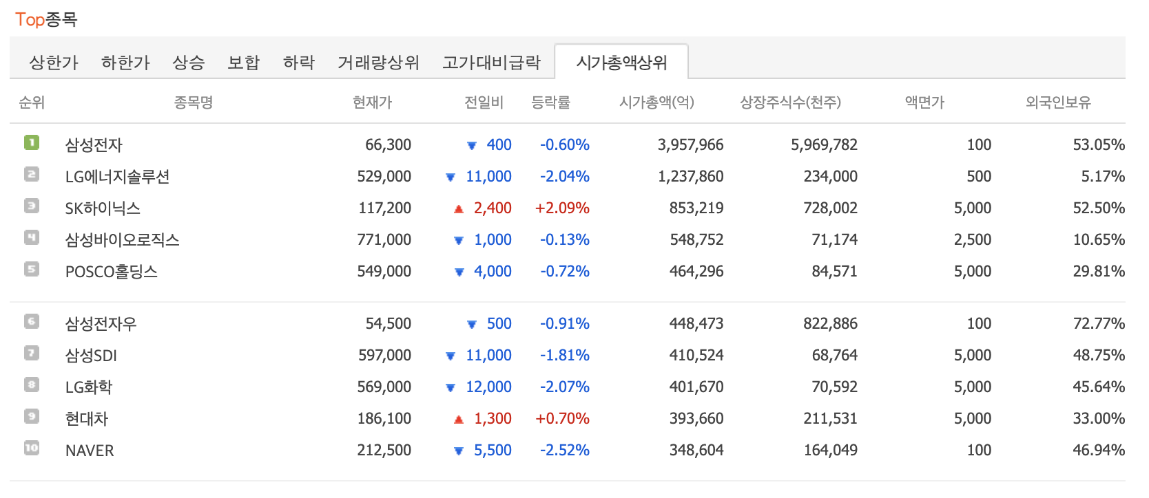 전세계 시가총액 순위와 미국 증시 마감현황 2023년 8월 18일~21일 (자료: 컴퍼니즈마켓캡,핀비즈)