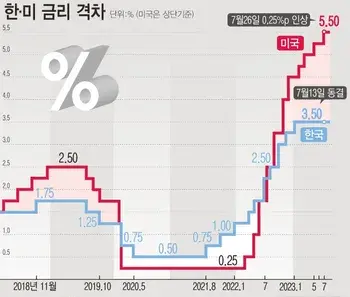 한.미 금리 격차 그래프와 한국 금리결정 히스토리 (자료: 나무위키, 인베스팅닷컴)