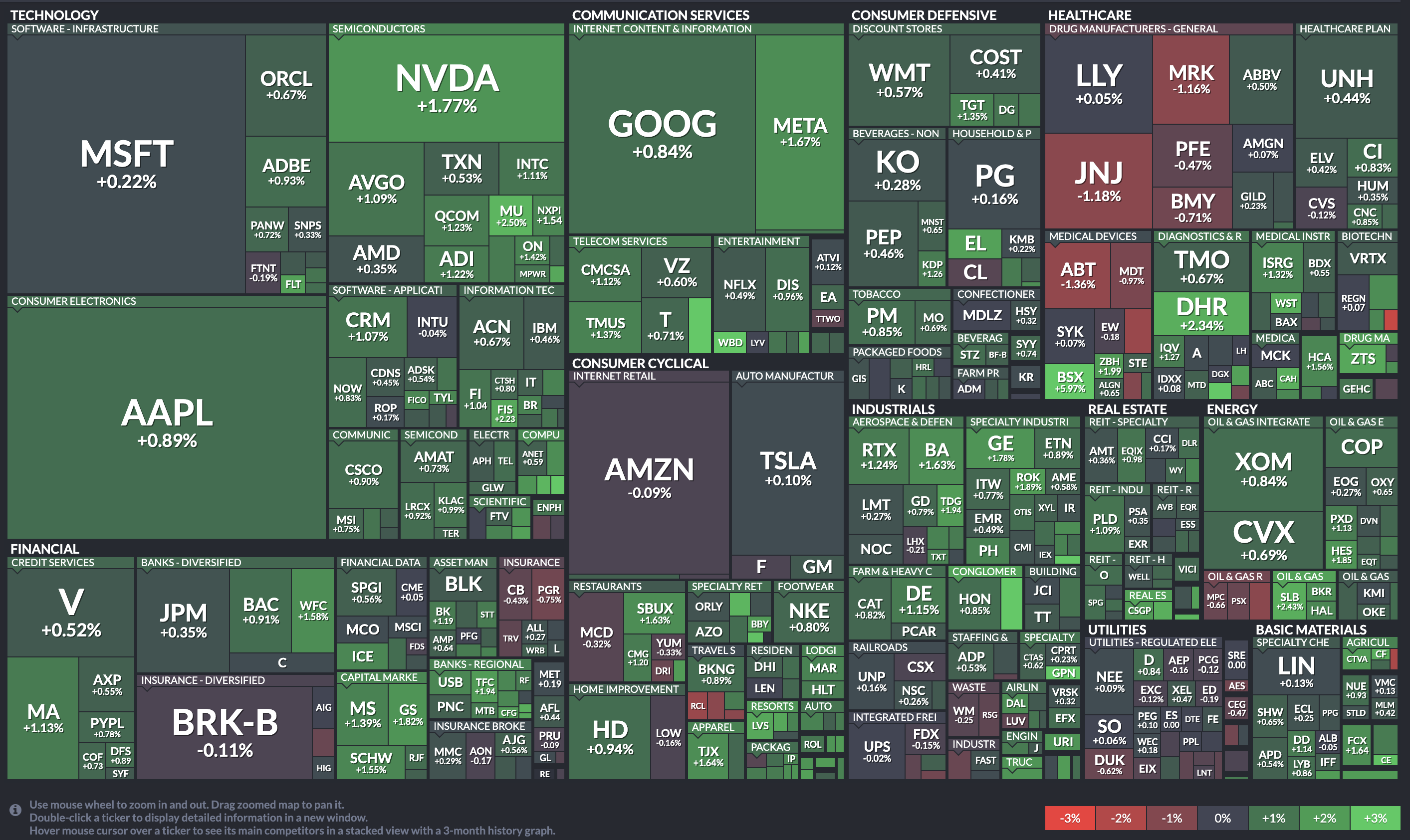 엔비디아 1.78%, 메타 1.67% 상승을 중심으로 기술주가 상승했다. 애플 0.88%, 마이크로소프트 0.22%, 알파벳 0.87%, 넷플릭스 3.48% 상승 마감했다.