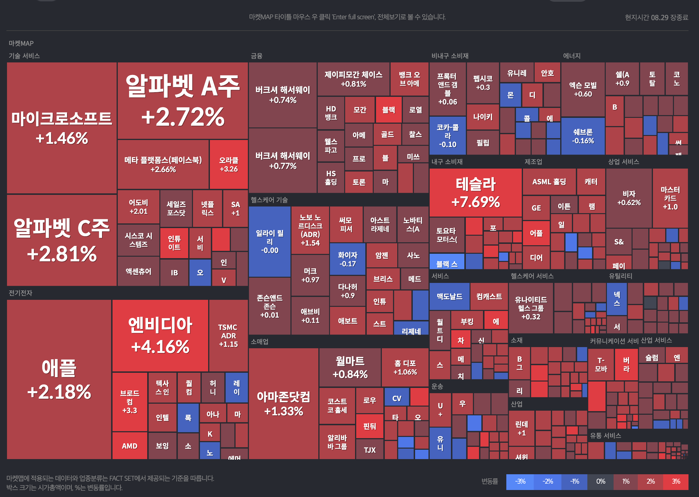 기술주가 상승했다. 애플 2.18%, 마이크로소프트 1.46%, 아마존 1.33%, 엔비디아 4.16%, 메타 2.66%, 알파벳 2.72%, 넷플릭스 2.85% 상승 마감했다. 애플은 오는 9월 12일에 '애플 이벤트'를 개최할 것이라고 발표해 시장은 이날 애플의 신형 아이폰이 공개될 것으로 예상하고 있다.