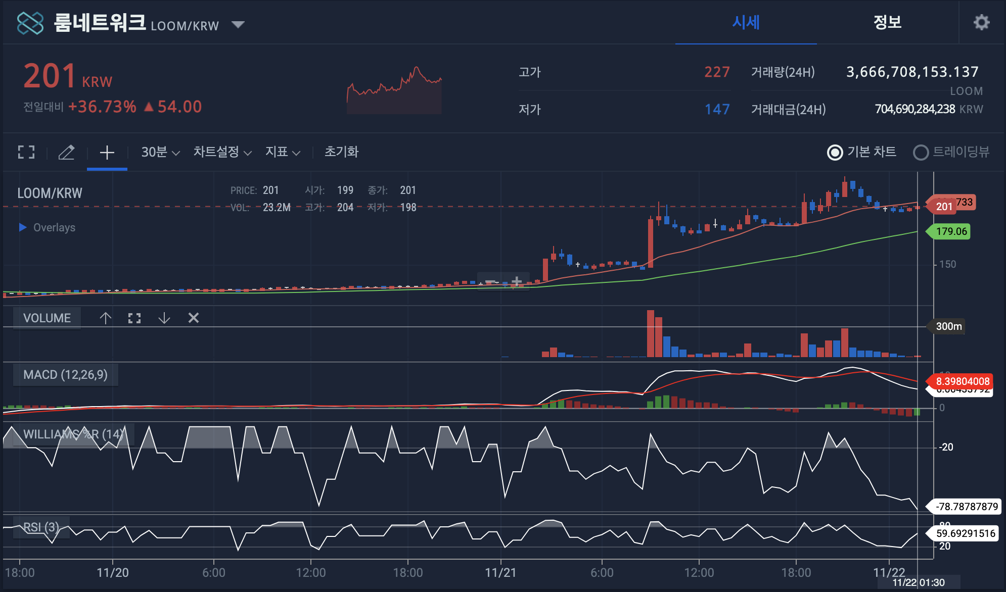 룸네트워크 현재 시세가 전일 대비 36.73% 오른 201원에 거래되고 있고, 20일까지는 거래량이나 가격 변동폭이 높지 않다가 어제 21일 부터 갑자기 상승폭이 크게 커진것을 볼수 있었다. 11월 21일 21시를 기점으로 227원에 최고가를 찍은 뒤로 살짝 가격이 떨어지면서, 다시 매수 시그널 구간에 근접하게 떨어지고 있다.