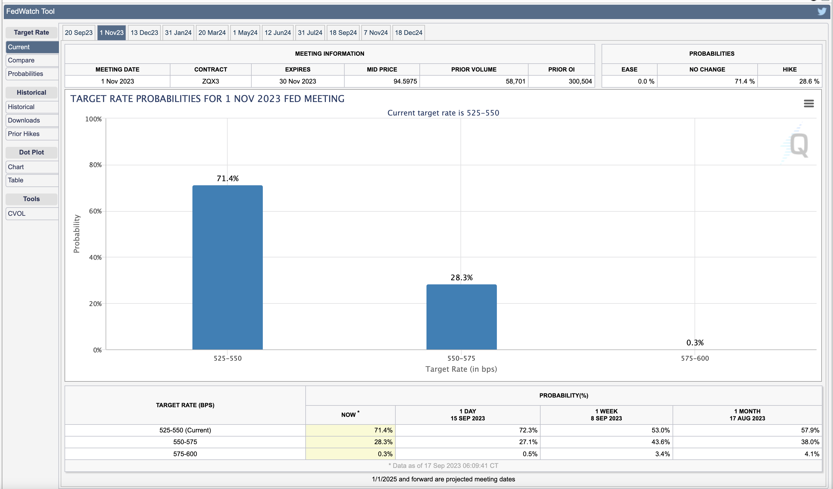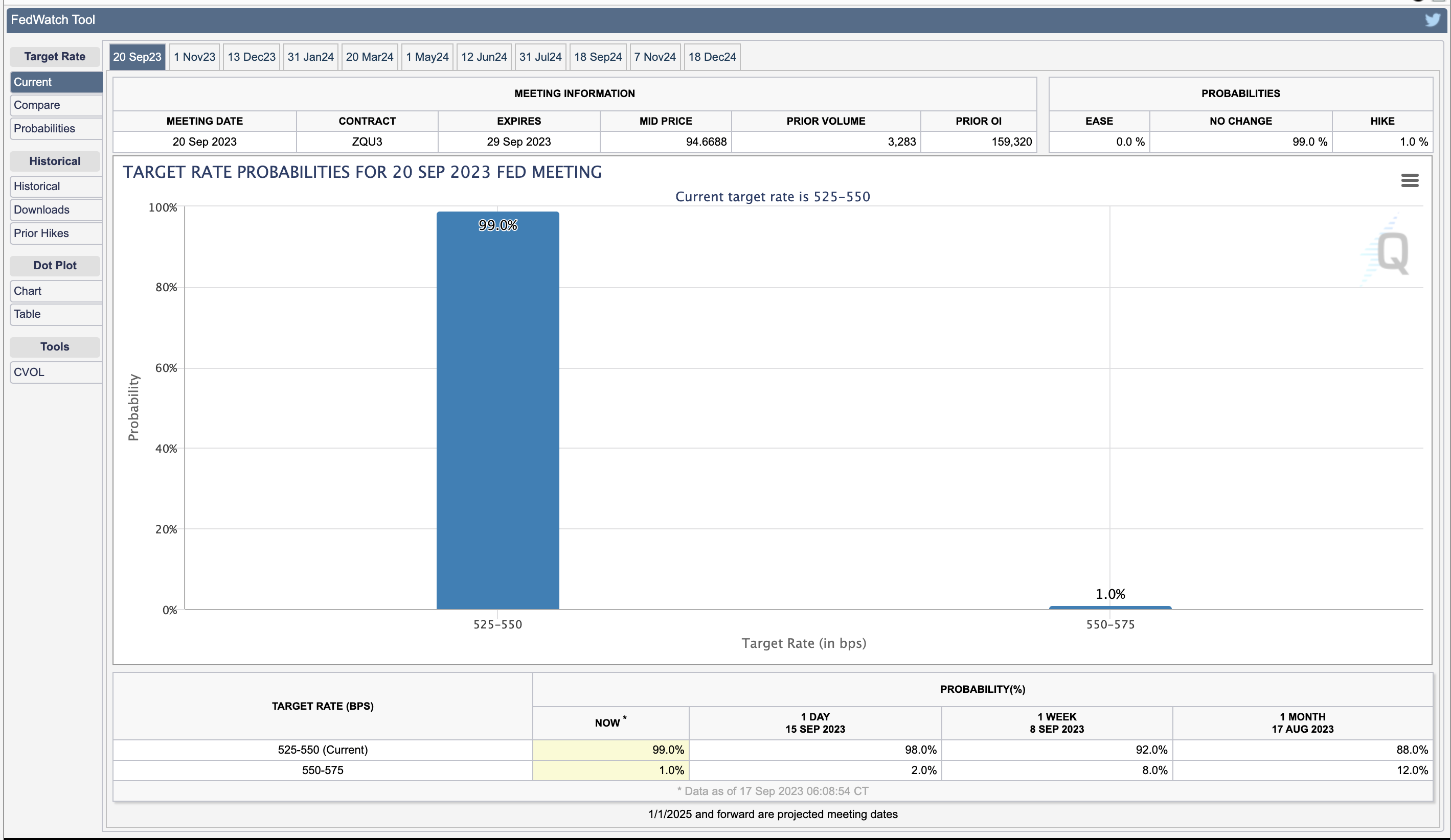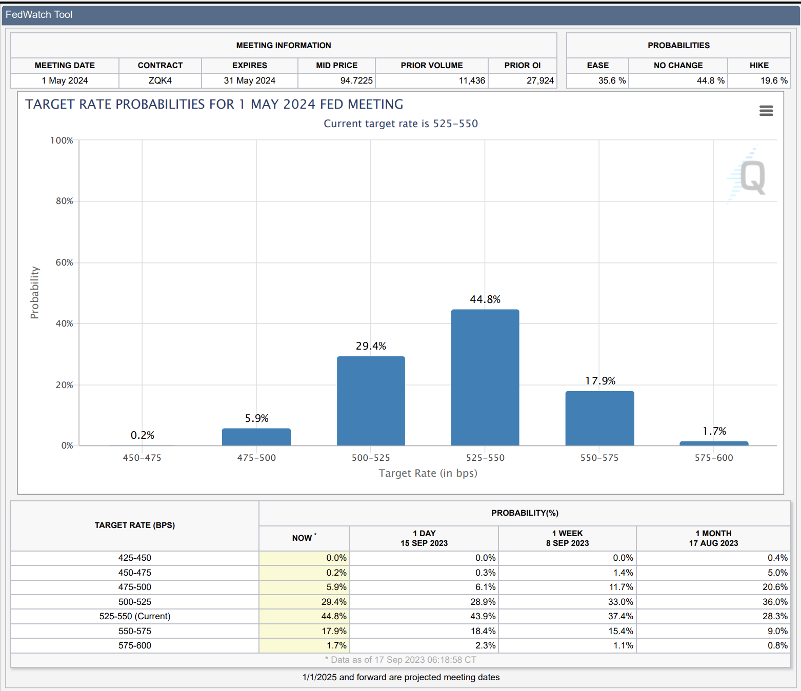 미국 예상 금리 점도표 2023년 9월 18일 08:20 (자료: CME그룹)