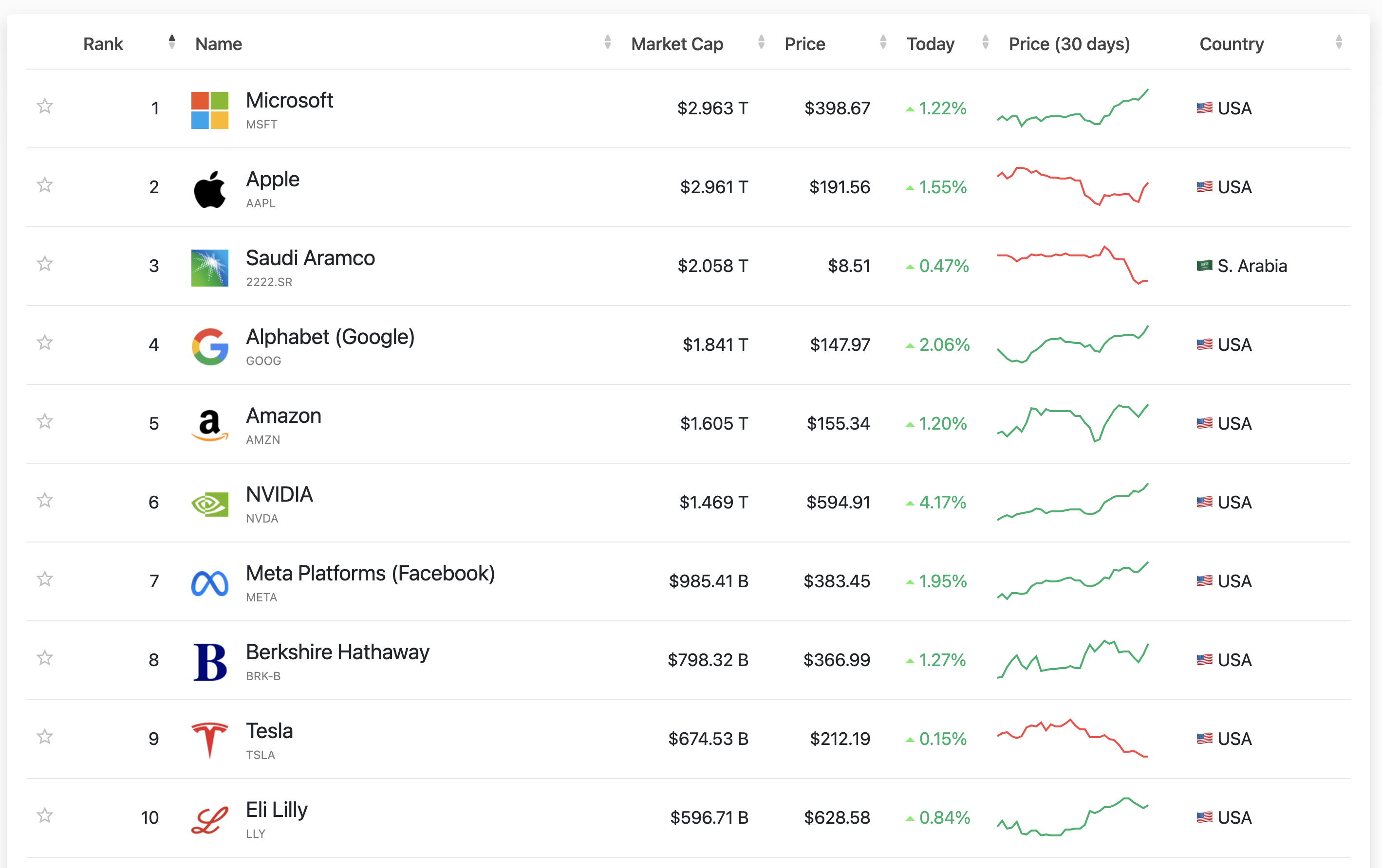 | 1 | 마이크로소프트 | 2,441,818 (2023년) | 8.05 (2023년) /9.09 (2024년 예상) | 189,135 (2023년) / 210,784 (2024년 예상) | 85,314 (2023년) / 94,993 (2024년 예상) | 26.66 (2023년) / 24.06 (2024년 예상) | 5.99 (2023년) / 5.42 (2024년 예상) | 18.95 (2023년) / 17.01 (2024년 예상) | 0.79 (2023년) |