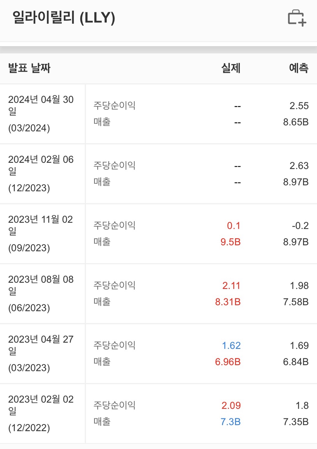 | 9 | 일라이릴리 | 313,440 (2023년) | 18.08 (2023년) / 20.91 (2024년 예상) | 30,410 (2023년) / 34,175 (2024년 예상) | 11,410 (2023년) / 13,175 (2024년 예상) | 17.93 (2023년) / 15.49 (2024년 예상) | 53.23 (2023년) / 45.67 (2024년 예상) | 18.06 (2023년) / 15.46 (2024년 예상) |