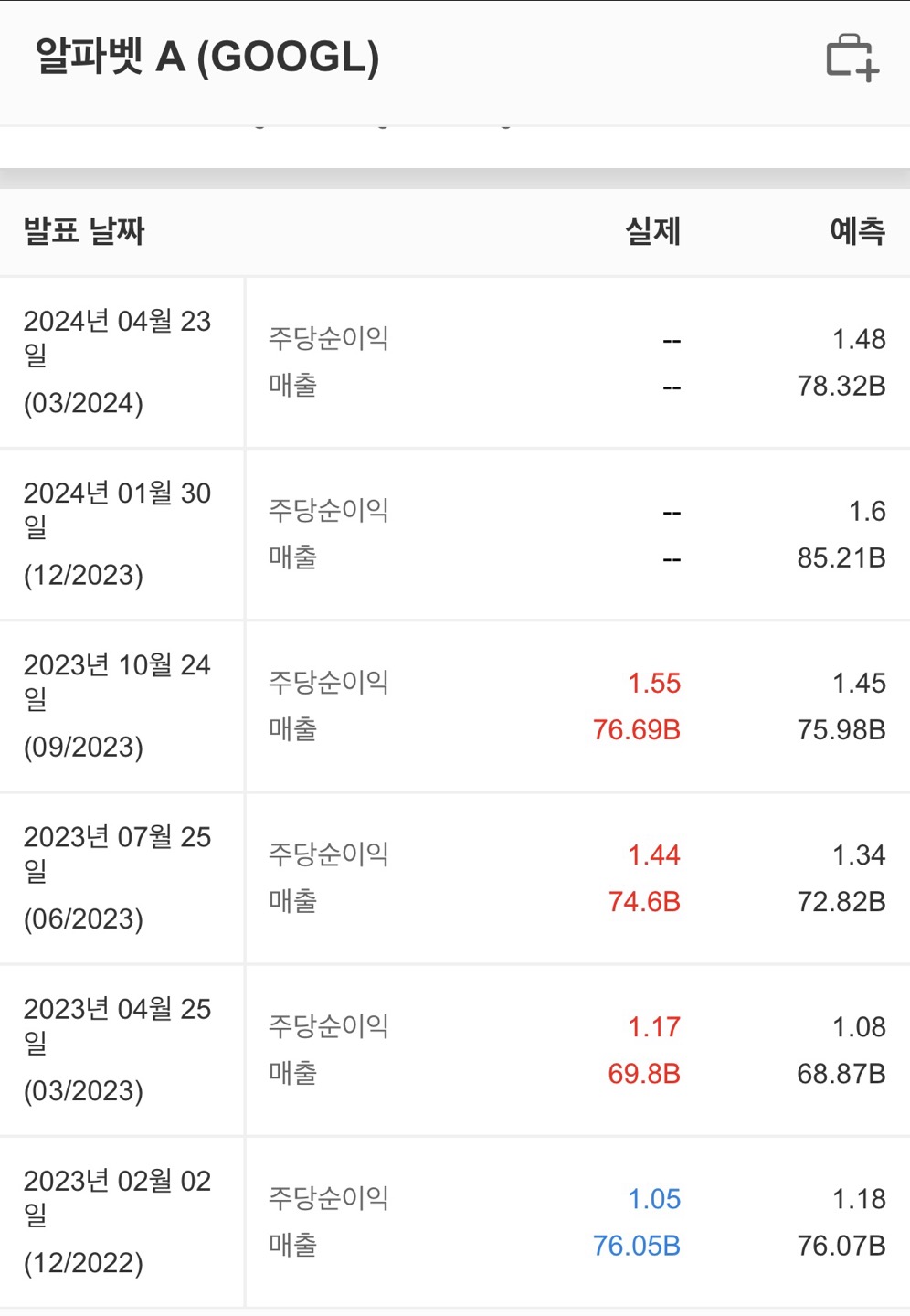 | 3 | 알파벳(구글) | 1,392,635 (2023년) | 23.57 (2023년) / 28.35 (2024년 예상) | 277,367 (2023년) / 323,494 (2024년 예상) | 75,857 (2023년) / 93,798 (2024년 예상) | 38.11 (2023년) / 30.61 (2024년 예상) | 6.51 (2023년) / 5.59 (2024년 예상) | 15.43 (2023년) / 12.36 (2024년 예상) | 0.99 (2023년) |