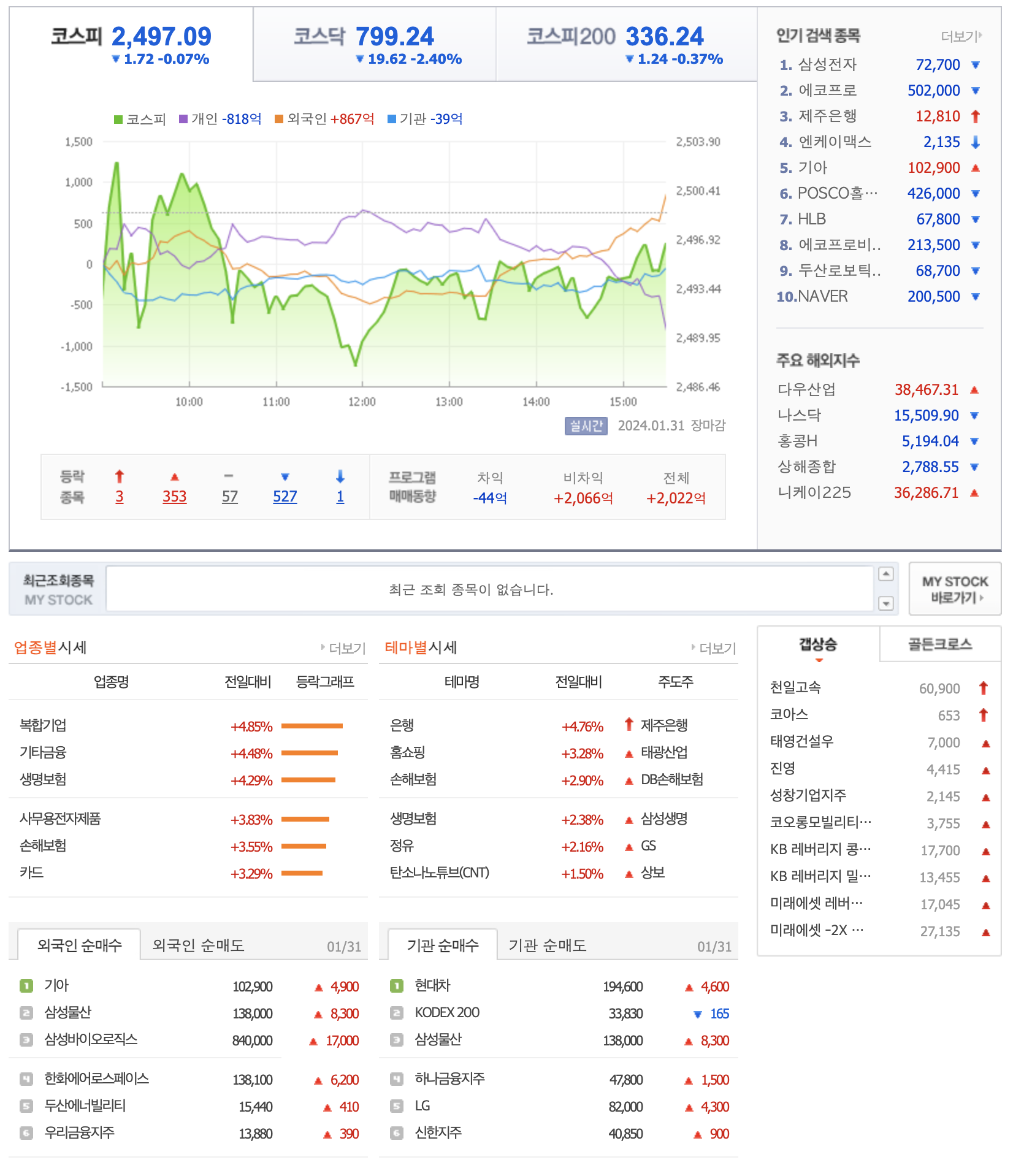 국내 증시 마감현황 2024년 1월 31일(출처: 네이버금융)