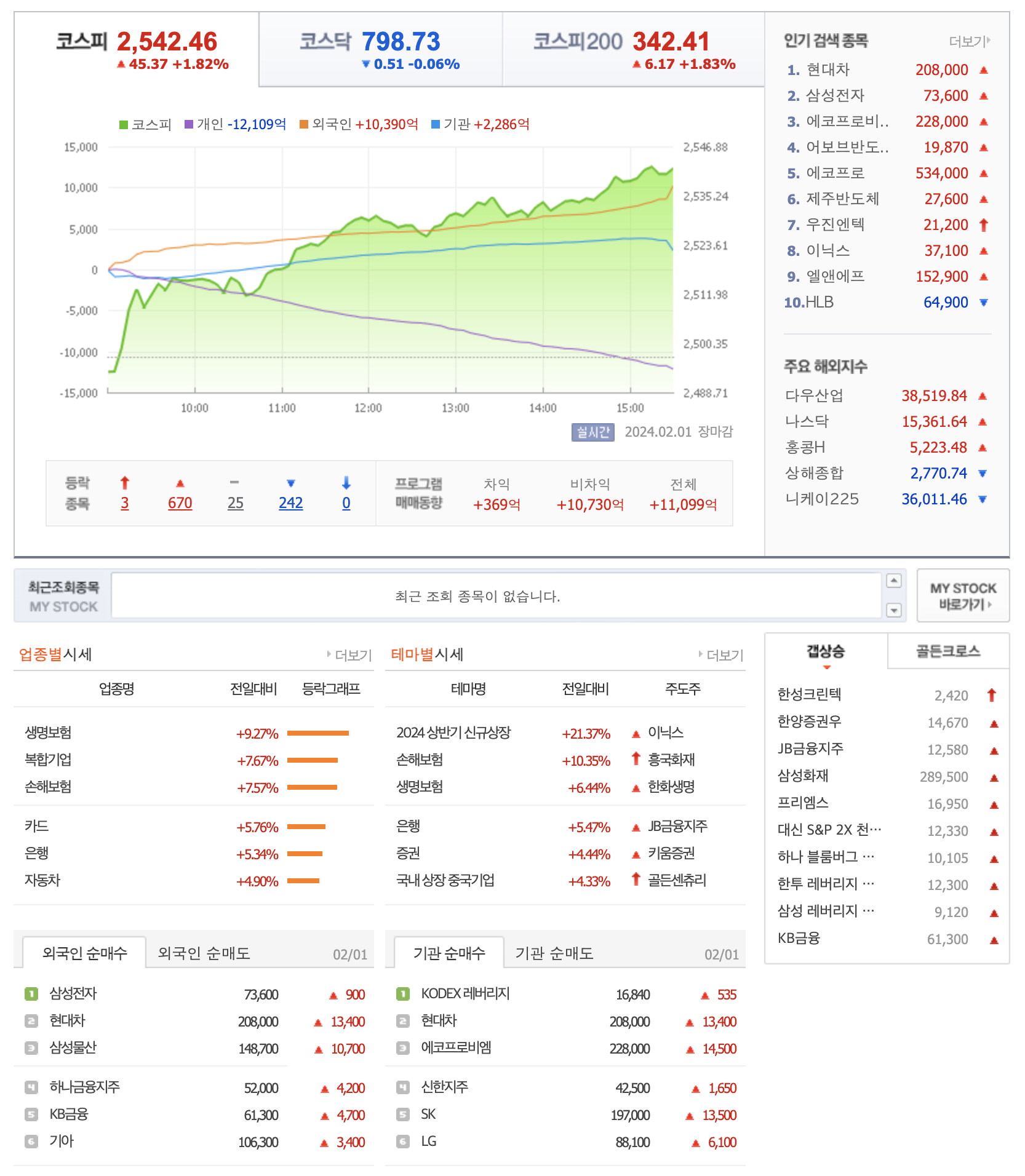 국내 증시 마감시황 2024년 2월 1일 (출처: 네이버 금융)
