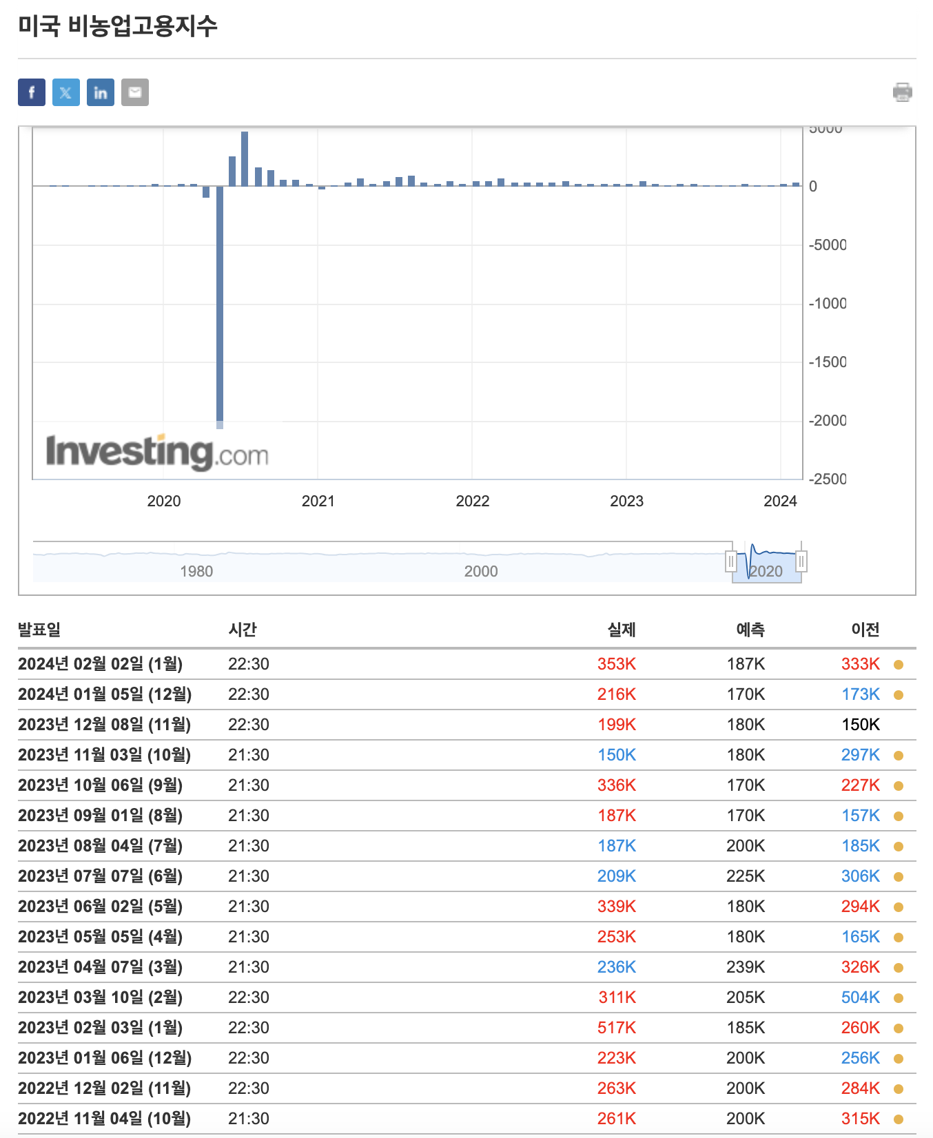 2024년 1월, 미국 비농업 일자리는 전월 대비 35만 3천 건 증가하며, 전문가 예상치인 18만 5천 건을 크게 상회했습니다. 이는 작년 1월 이후 최대 증가 폭으로, 미국 경제가 여전히 견조한 성장세를 유지하고 있음을 시사합니다.