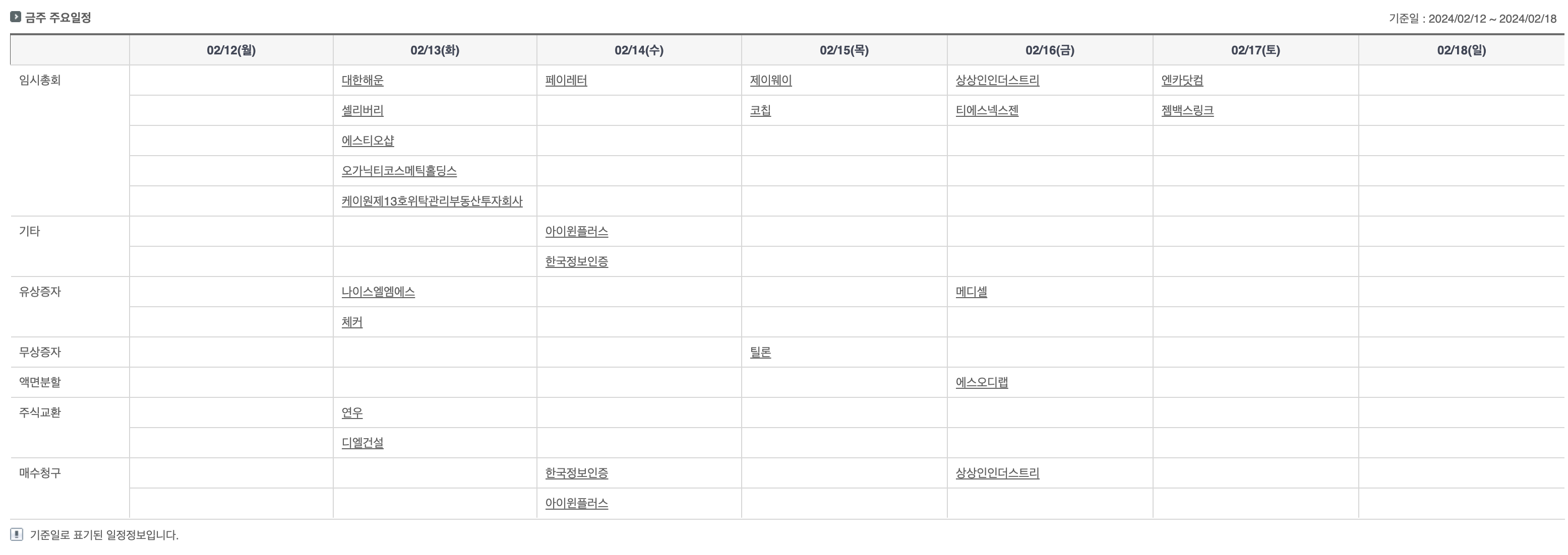 국내 주간 증시 캘린더 2024년 2월 3주 (출처: 증권정보포털)