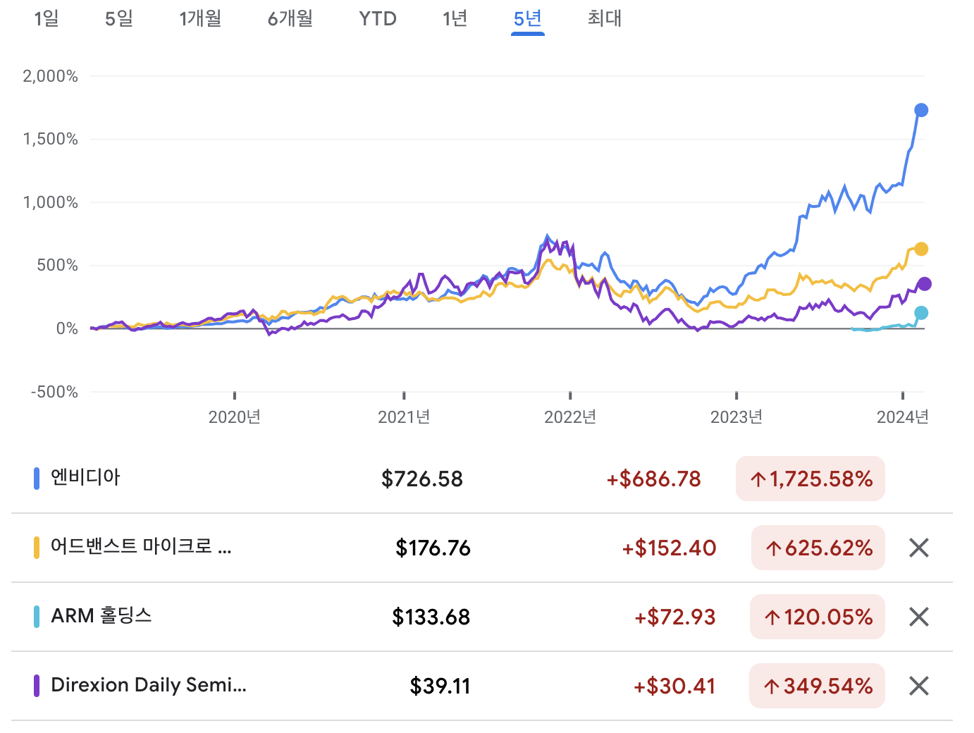 상승률을 비교하면, 반도체 대장주인 엔비디아는 파란색 선으로 가장 높은 상승률을 보여줍니다. 엔비디아(파란색 선)은 현재 주가가 $726.58로 1,725.58%로 상승했으며, 5년 전 시작지점에서 $686.78의 증가를 기록했습니다. AMD(노란색 선)은 현재 주가 $176.76로 625.62%로 상승했으며, 시작 지점에서 $152.40의 증가를 기록했습니다. ARM(하늘색 선)은 현재 주가 $133.68에서 120.05%로 상승했으며, 시작 지점에서 $72.93의 증가를 기록했습니다. SOXL(보라색 선)은 현재주가 $39.11349.54%로 상승했으며, 시작점에서 $30.41의 증가를 기록했습니다.
