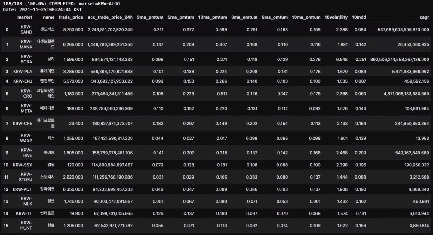 그림1. 퀀트분석 코인 종목 추천(분석날짜 기준 2021년 11월 25일 00:24, KST)