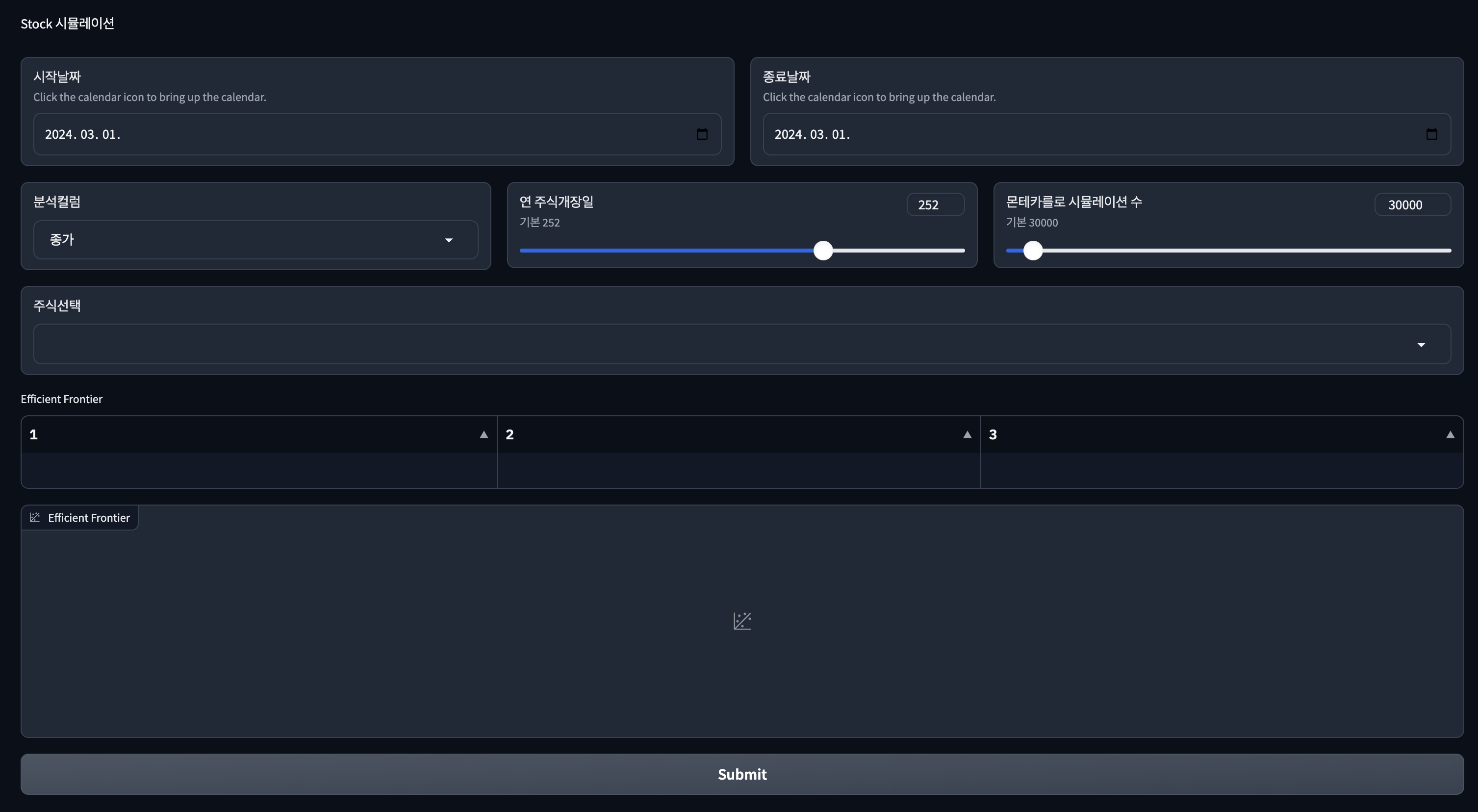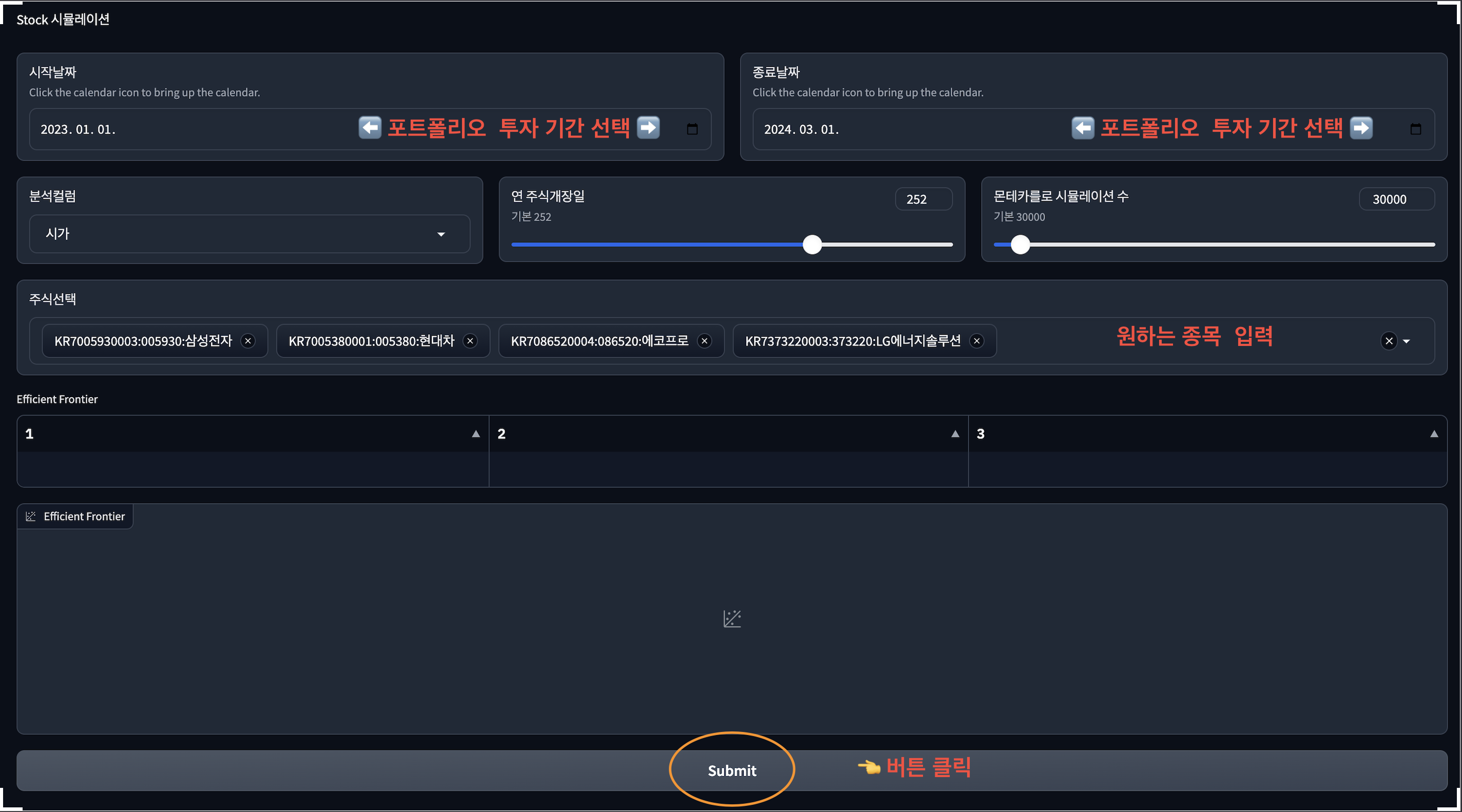 Efficient frontier (효율적 투자선)를 몬테카를로 시뮬레이션을 통해 쉽고 간단하게 사용해볼 수있도록 테스트 해볼 수 있는 프로그램 열어두었습니다. (업데이트 오늘간만 오픈)