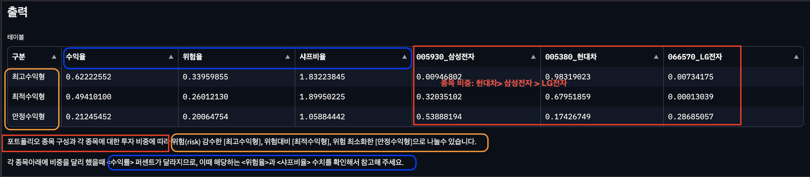 각 종목아래에 비중을 달리 했을때 <수익률> 퍼센트가 달라지므로, 이때 해당하는 <위험율>과 <샤프비율> 수치를 확인해서 참고해 주세요.