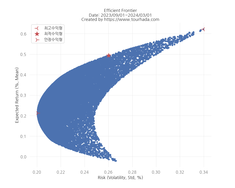 쉽게 말해, 높은 위험 감수시에 [최고수익형] 투자 방식으로 포트폴리오 종목 비중을 설정했을 때 수익률을 확인해 보면 되고, 샤프지수에 따라 위험대비 [최적수익률] 얻고을 수 있는 종목 비중을, 위험을 최소화 했을때 [안정수익형] 종목 비중에 따른 수익률 차이를 확인해 보는 것으로 위에 분석 결과를 확인해 보시면 됩니다.