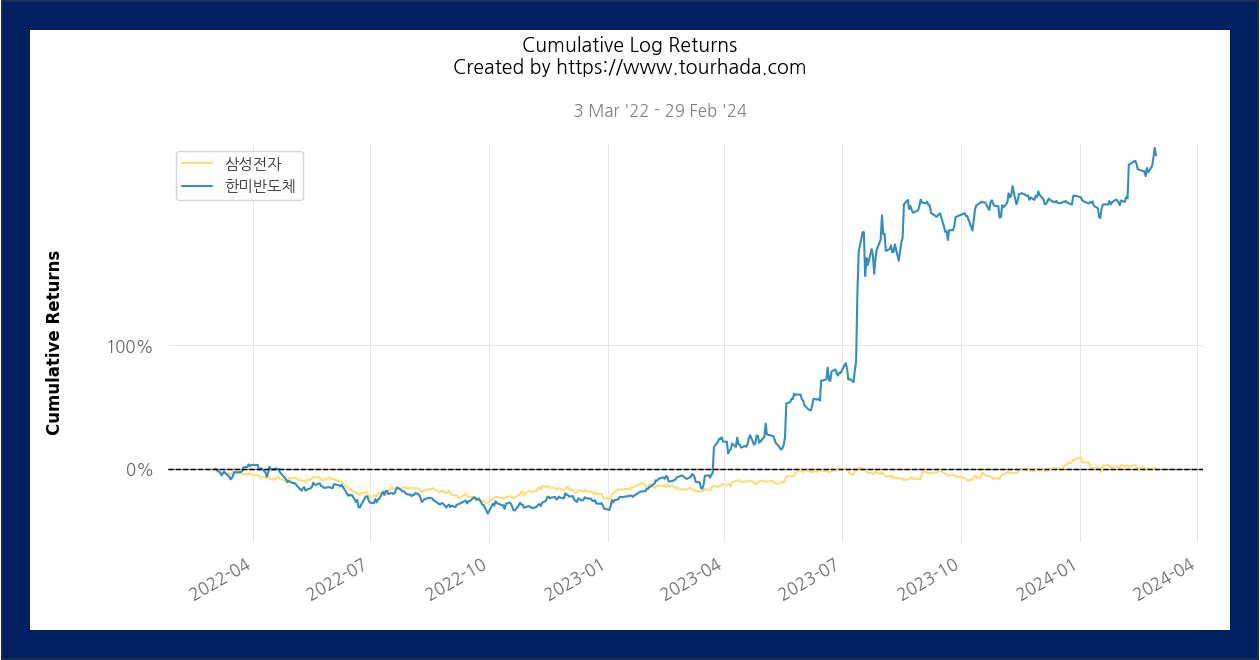 본 그래프는 한미반도체와 삼성전자(Benchmark)의 누적 수익률을 비교 분석한 것으로, 이는 투자자들에게 각 지역의 반도체 산업 내 기업들의 장기적 성과를 이해하는데 도움을 줍니다. 분석 기간 동안 한미반도체 기업의 주식은 탁월한 누적 수익률을 보여주었습니다. 특히 마지막 분기에 주가가 급등함으로써 투자자들에게 매우 유리한 시장 상황을 제공했습니다. 이는 기술 혁신이나 중요한 경영 결정, 혹은 시장 점유율의 확대와 같은 긍정적인 요인에 기인할 수 있습니다.