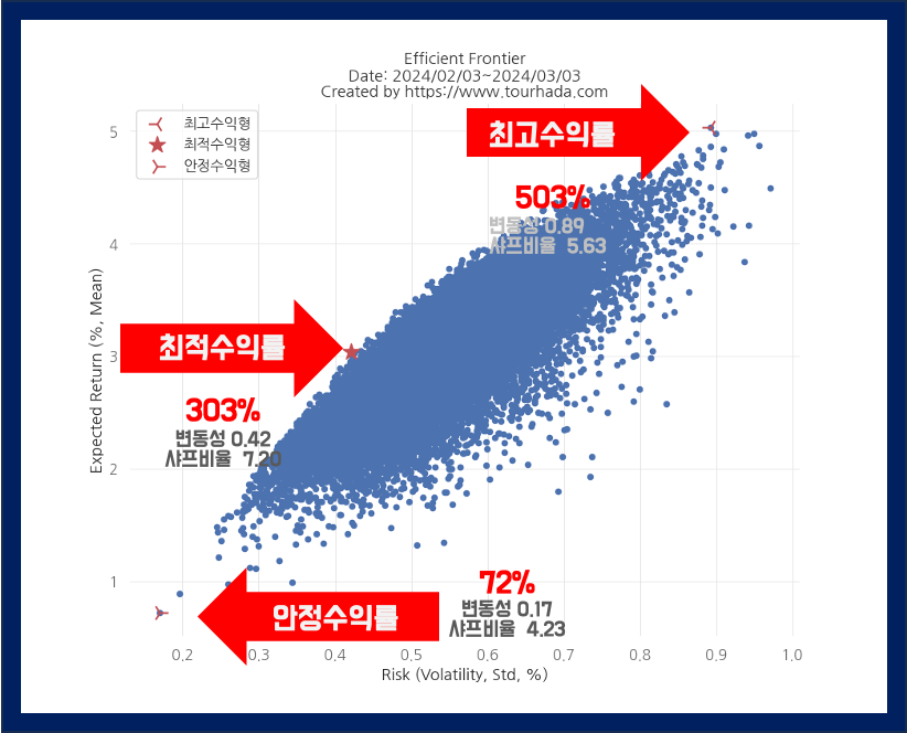 이 이미지는 분석 기간이 2024년 2월 3일 부터 3월 3일까지 최근 한달간 한국 반도체 산업에 대한 투자 포트폴리오의 효율적 투자 경계(Efficient Frontier) 모델을 이용하여 위험-수익 프로파일을 분석합니다.
