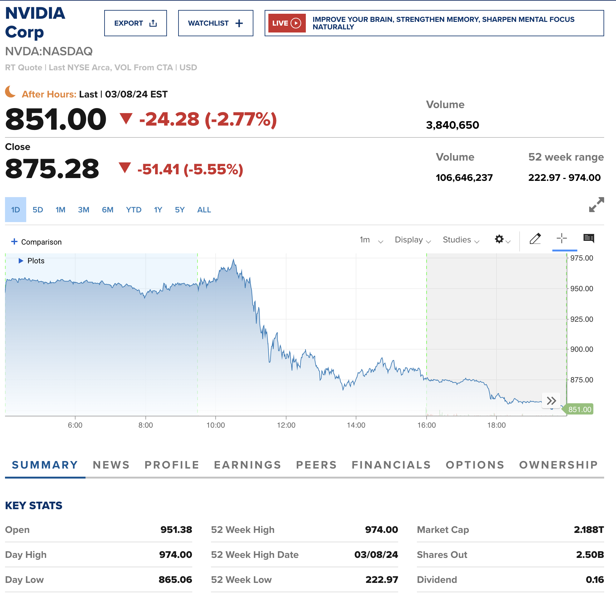 지난주 마지막 거래일 현지 금요일(한국 토요일) 미국 반도체주 및 엔비디아 주가가 급락했습니다. 특히, 상승 주도주였던 엔비디아는 974$까지 상승했다가 865$로 하락했다가 875.28$(-5.55%) 하락 마감했고, 에프터마켓에서도 -2.77% 추가 하락했습니다. 반도체 ETF도 -4.05%하락 마감한 228.13에 거래를 마치고, 에프터마켓에서도 -0.50% 추가 하락했습니다. 이에 한국 월요일 장 시작할 때도 반도체 관련주들도 하락 할 여지가 있으니 투자 하실때 주의 하셔야 겠습니다.
