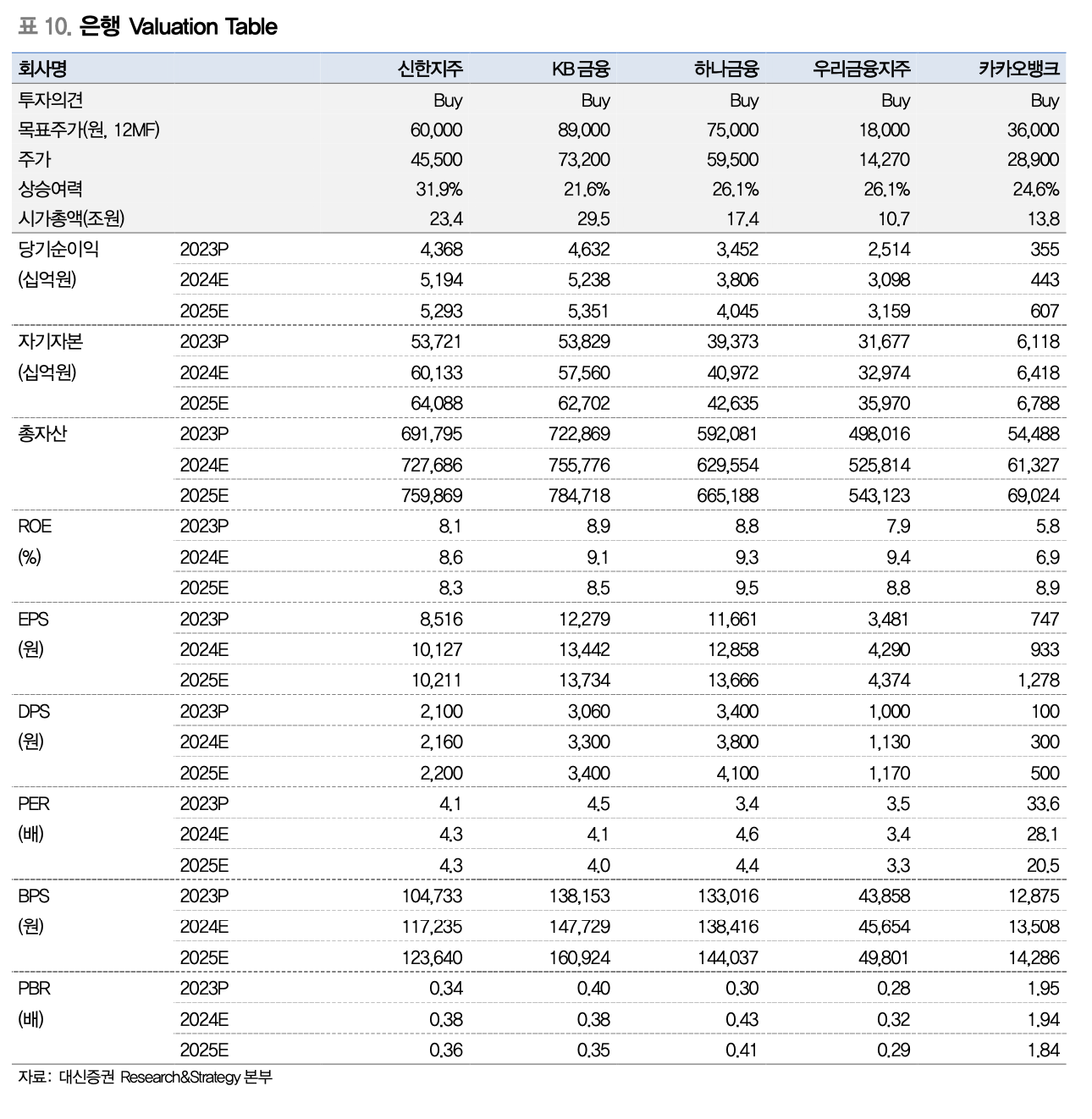 은행 Valuation Table(출처: 대신증권)