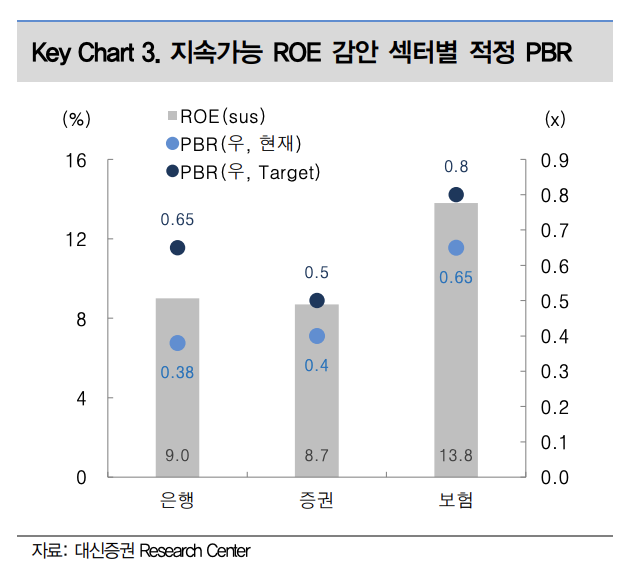만년 저 PBR이었던 금융주에게 이런 기회가 찾아온 것은 실로 오랜만이고, 주가가 크게 올랐지만 은행/증권의 sustainable ROE가 8~9%, 보험이 13.8%임을 감안하면 여전히 Valuation은 부담 없다. KB금융 기준 역사적 Valuation 고점은 0.74x로 금리 상승에 따 른 이자이익의 비약적 개선과 성공적인 M&A로 비이자이익이 증가하며 ROE가 크게 상승한 시기였다. 전술한 바와 같이 금융지주의 지속가능한 ROE가 8~9%, 보험사는 13% 이상임을 감안하면 각 섹터 당 가장 높은 Valuation을 받는 KB금융, 삼성화재 기 준 각각 PBR 0.7x, PBR 1.0x까지 멀티플 상승이 가능하다는 판단이다. 그리고 무엇보다 우리가 앞서 분석한 바와 같이 정책이 연내 지속적으로 업데이트 될 것이고 지수 및 ETF조성 등으로 긍정적인 수급을 기대하는 바 KB금융, 신한지주, 하나금융지주와 증권 커버리지 5사의 목표주가를 상향 조정한다. 목표주가 상향 근거는 2024년 BPS적용 및 금리 하락에 따른 COE 조정이다.