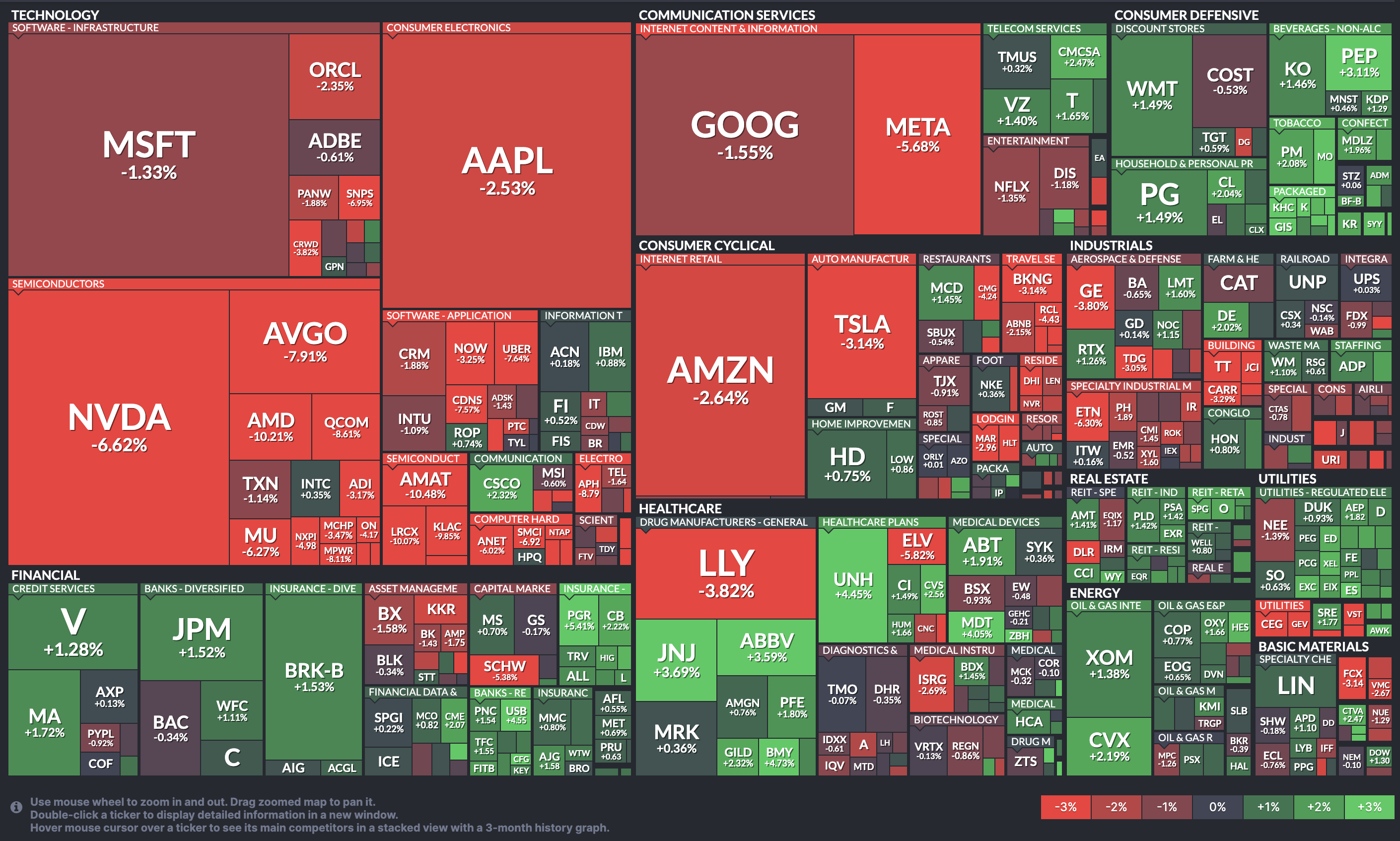 메타 플랫폼스는 5.7% 하락했고, 넷플릭스와 마이크로소프트는 1% 이상 하락했습니다. 애플도 2.5% 하락했습니다. 반도체 주식은 바이든 행정부가 중국에 대한 기술 접근 제한을 강화할 가능성이 있다는 소식에 따라 크게 하락했습니다. VanEck 반도체 ETF(SMH)는 7% 이상 하락하며 2020년 3월 이후 최악의 하루를 기록했습니다. 엔비디아와 타이완 반도체 주식은 각각 6%와 8% 하락했습니다.