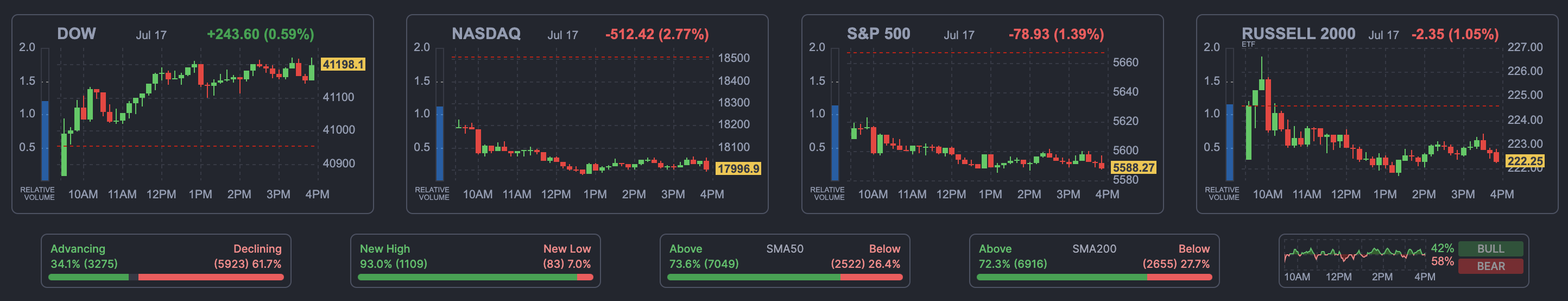 수요일 S&P 500 및 나스닥 종합지수가 고성장 기술주에서 금리 민감주로의 로테이션이 계속되면서 하락했습니다. S&P 500은 1.39% 하락한 5,588.27에 마감했고, 기술 중심의 나스닥은 2.77% 하락한 17,996.92로 2022년 12월 이후 최악의 세션을 기록했습니다. 반면 다우존스 산업평균지수는 243.60포인트(0.59%) 상승한 41,198.08로 처음으로 41,000을 돌파했습니다.