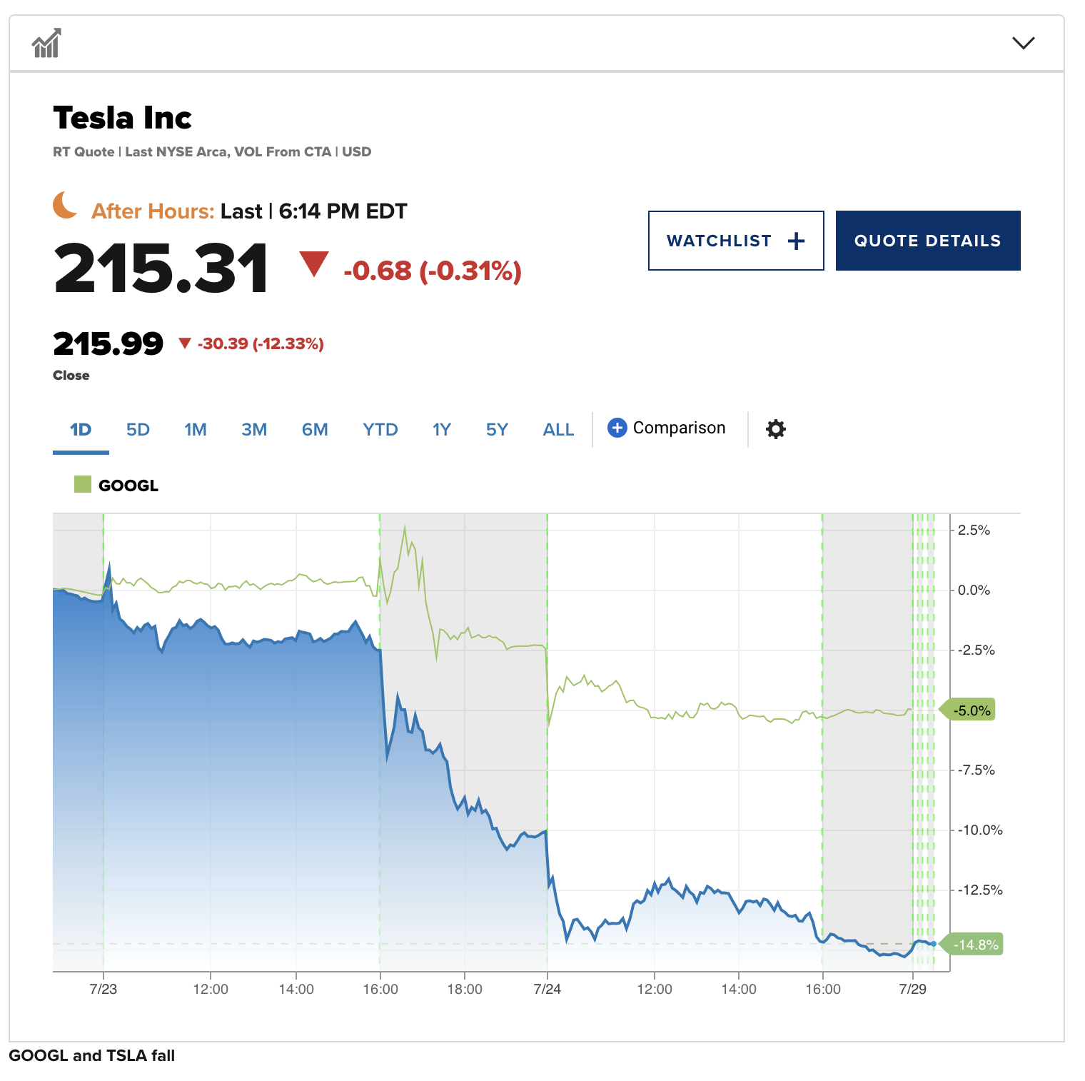 실제로, 주요 주가지수는 수요일에 하락세를 보였으며, 테슬라의 예상보다 저조한 실적이 주가를 8% 이상 하락시켰습니다. 유튜브 광고 수익 감소도 수요일에 알파벳 주식을 4% 이상 하락시켰습니다. — Lisa Kailai Han