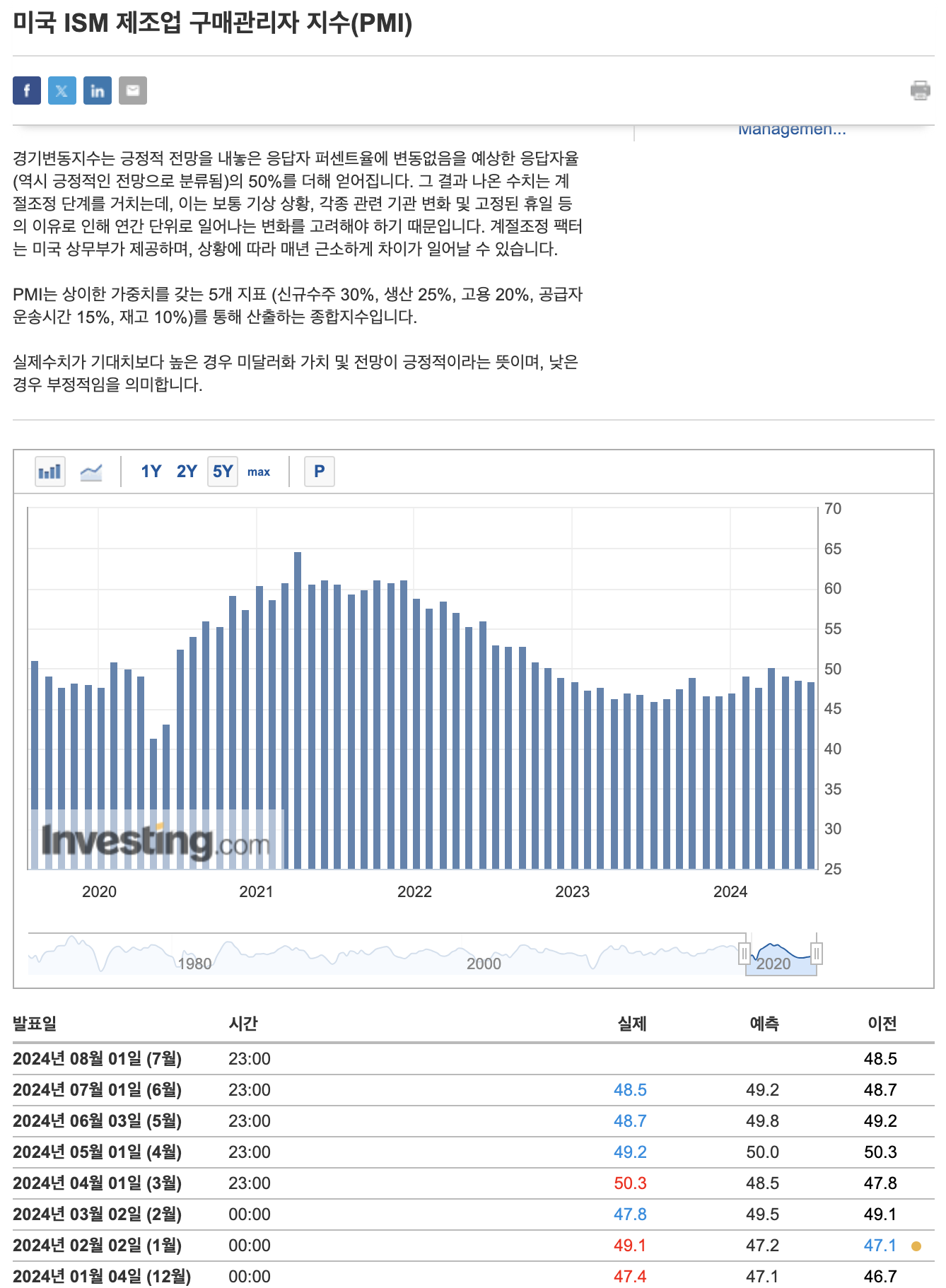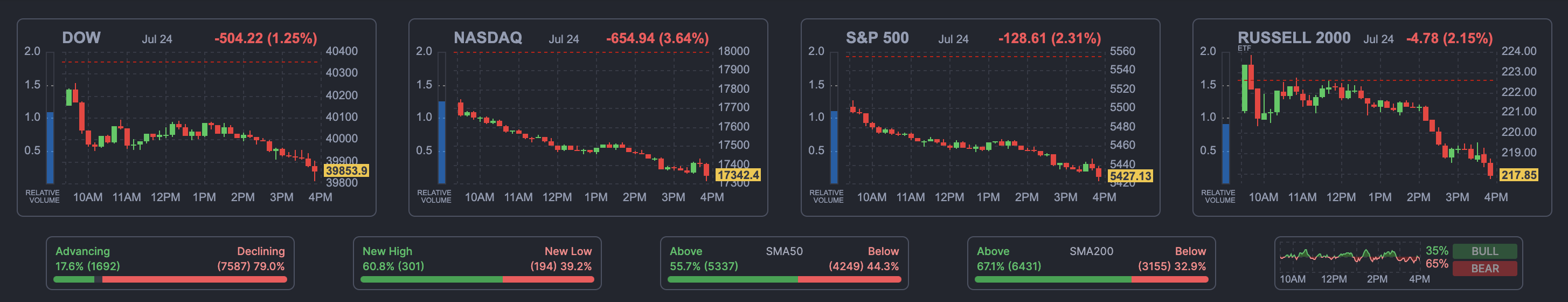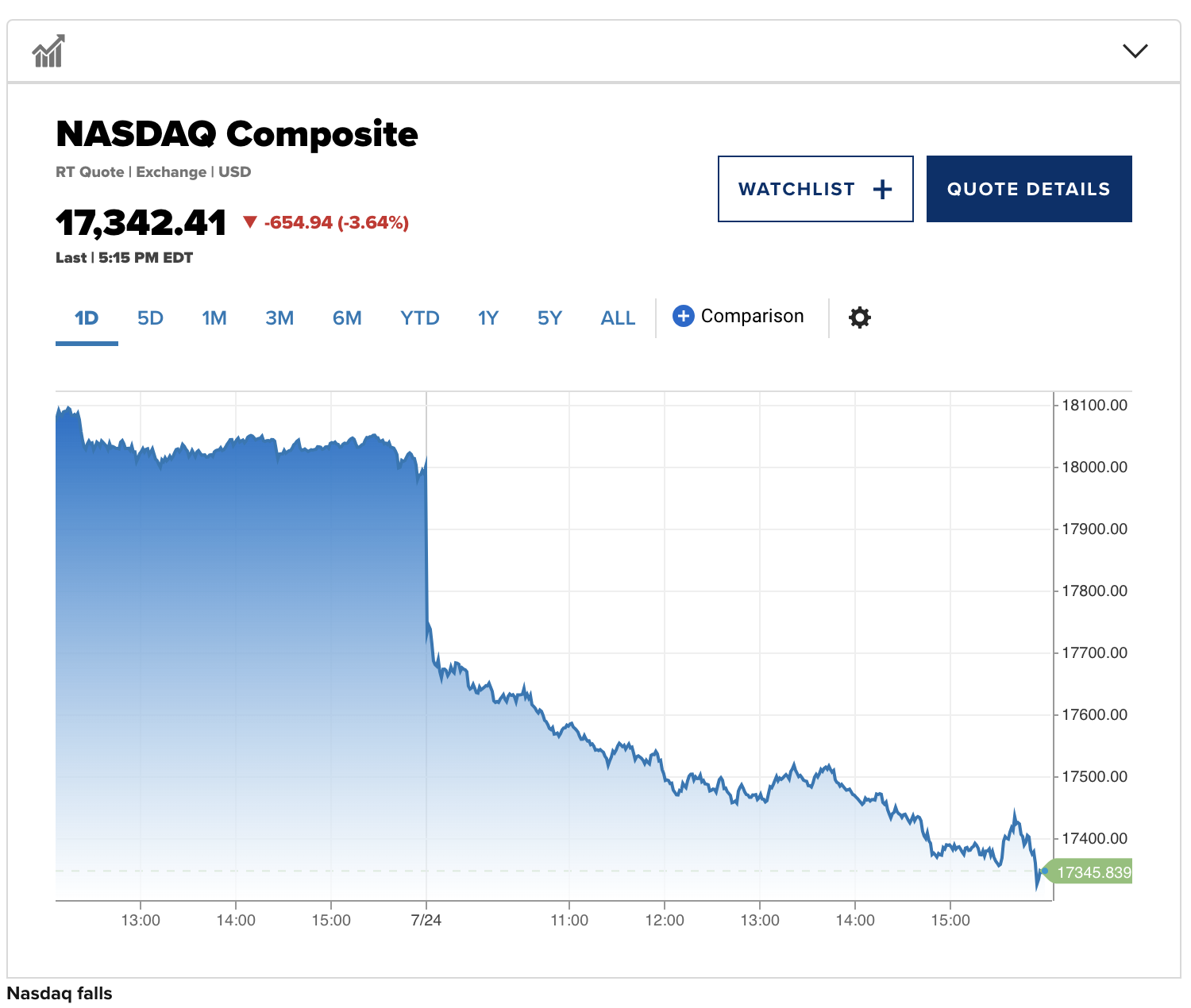 수요일 주식시장은 두 대형 기술 회사의 실망스러운 보고서로 인해 하락했으며, S&P 500 지수는 2022년 이후 최악의 날을 향해 가고 있습니다. 광범위한 시장 지수는 2.2% 하락했으며, 기술 중심의 나스닥 종합 지수는 3.5% 하락해 2024년 최악의 날을 맞고 있습니다. 다우존스 산업평균지수는 421포인트(1%) 하락했습니다. 구글 모회사 알파벳의 주가는 5% 하락하여 1월 31일 이후 최대 일일 하락률을 기록했습니다. 알파벳은 매출 및 순이익이 예상을 초과했지만, 유튜브 광고 수익이 예상치를 밑돌았습니다. 한편, 테슬라 주가는 11% 하락하여 1월 25일 이후 최악의 날을 기록했습니다. 테슬라는 예상보다 낮은 실적과 자동차 매출이 전년 대비 7% 감소한 것이 원인이었습니다. 다른 주요 기술주들도 알파벳과 테슬라와 함께 하락했습니다. 엔비디아와 메타 플랫폼스는 각각 6%와 5% 하락했으며, 마이크로소프트는 4% 하락했습니다. 이 보고서는 대형 기술 회사들이 2분기에 어떻게 실적을 기록했는지에 대한 첫 번째 시각을 제공하며, 월스트리트는 이 작은 그룹이 올해의 주요 상승 요인 중 하나였기 때문에 특별한 관심을 기울이고 있습니다. 수요일의 매도세는 과매수 시장, 높은 실적 기대치, 계절적으로 약한 주식 시장이라는 완벽한 폭풍에 의해 발생했습니다. 이는 투자자들에게 전혀 놀라운 일이 아니라고 Baird의 투자 전략가 Ross Mayfield는 말했습니다. "우리는 이번 매도를 결국 꽤 유효한 것으로 볼 것입니다. 왜냐하면 이는 강세 시장의 배경에서 발생했기 때문입니다. 강세 시장 내에서의 건강한 조정은 우리가 방어적으로 변하거나 변동성으로부터 돈을 보호하려는 것이 아니라 기회의 장소로 보는 것입니다."라고 Mayfield는 CNBC와의 인터뷰에서 말했습니다. 수요일 매도세 속에서 상대적으로 밝은 점은 Russell 2000 소형주 지수로, 하루 동안 1.5%만 하락했습니다. 월간으로는 8% 상승했으며, 최근 투자자들이 대형 기술주에서 소형주로 회전하기 시작한 결과입니다. 다우지수는 2% 상승한 반면, S&P 500은 0.4% 하락했으며 기술 중심의 나스닥은 거의 2% 하락했습니다. 대형 기술주의 실망에도 불구하고, 전체적인 실적 시즌은 강하게 시작되었습니다. S&P 500 기업 중 25% 이상이 2분기 실적을 발표했으며, 이 중 약 80%가 예상을 상회했다고 FactSet 데이터는 보여줍니다. 수요일 아침 투자자들의 우려를 더한 것은 예상보다 낮은 미국 제조업 데이터였습니다. 미국 PMI 플래시 제조업 생산 지수는 7월에 49.5로 하락하며 예기치 않게 수축 영역에 진입했습니다. 이는 새로운 주문, 생산 및 재고가 감소했기 때문입니다. 경제학자들은 51.5의 지수를 예상했습니다.