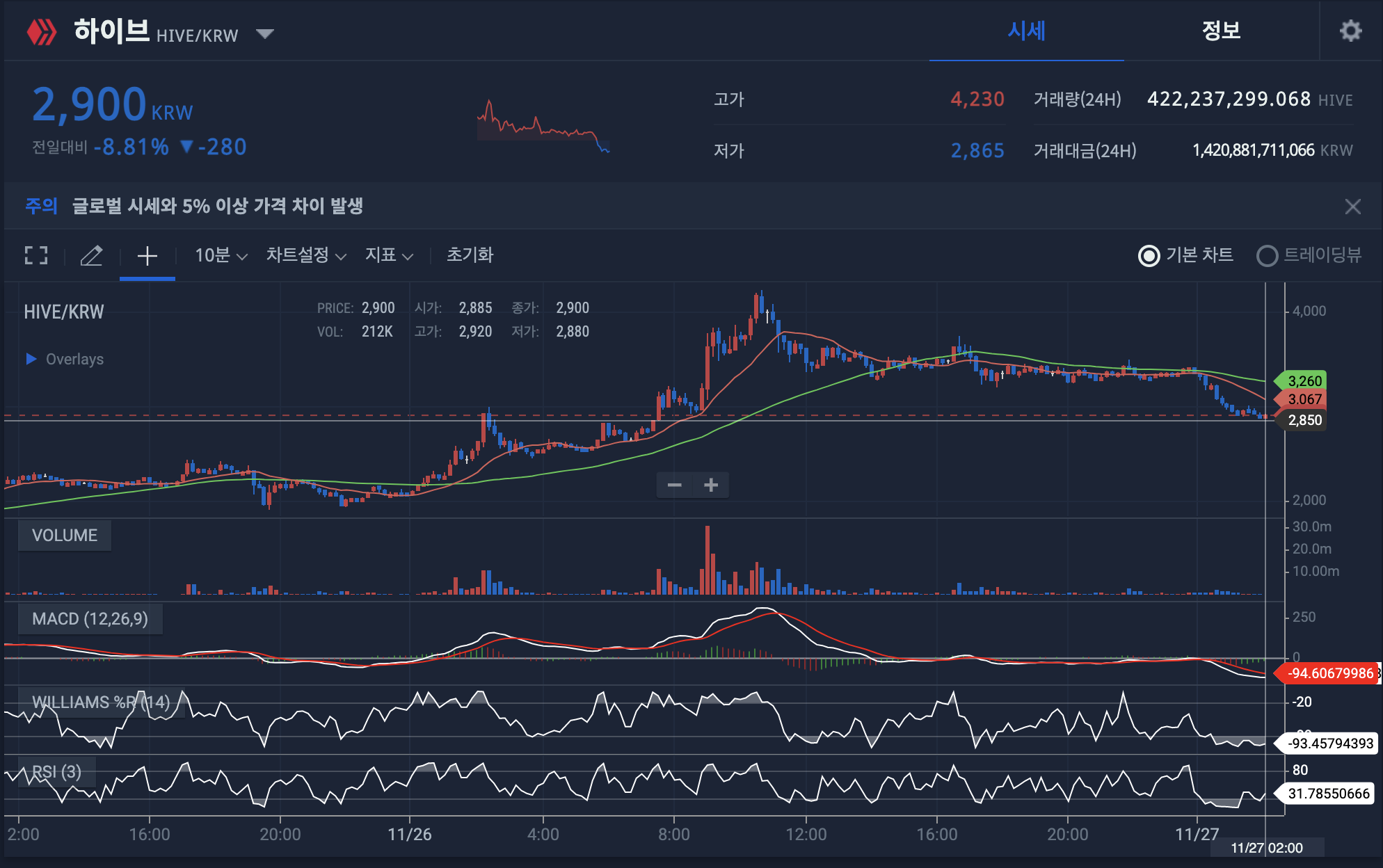 2021년 11월 26일 오전 10시 40분쯤에 4,230원 최고가가 나온이후로 가격이 떨어지면서 옆으로 흐르다가 최근에 한단계 더 하락하는 시장세이다. 지금이 주말이기도 하고해서 전반적인 코인 시장이 하락 추세이긴 하나 아무래도 BTS 관련 NFT와는 관련이 없음이 밝혀지면서 실망 매물들이 나오고 매수자가 적어지면서 수급히 현격하게 줄어든 양상을 보인다.