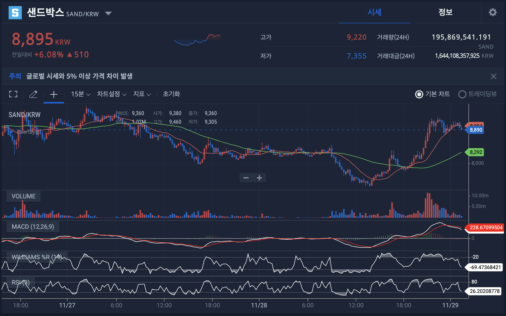 이중에서 가장 안정적으로 모멘텀이 우상향으로 흐를 가능성있는 샌드박스 종목 시세를 확인해 보겠다.