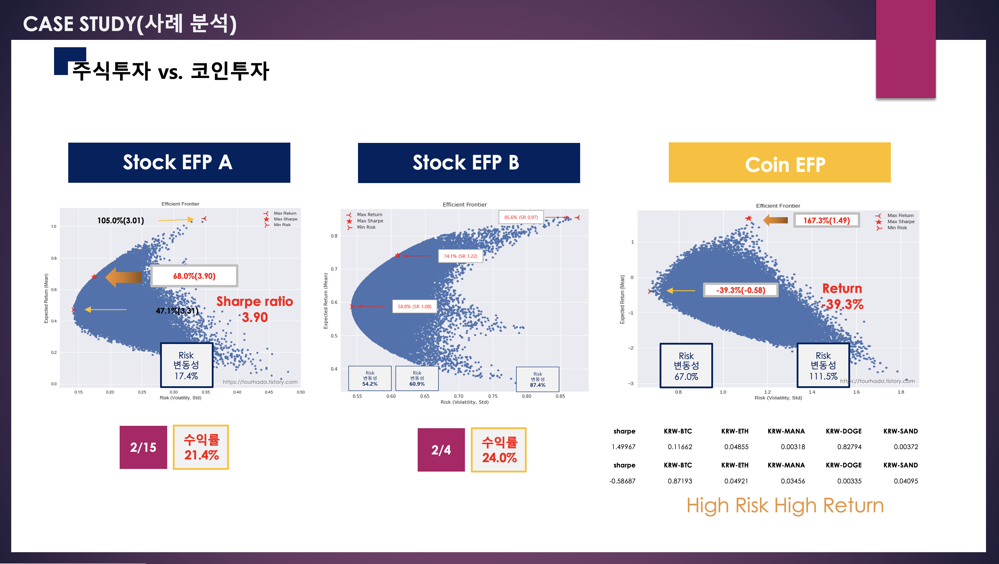 낮은 변동성과 높은 변동성. 즉, 위험 대비 리스크 프리미엄을 떠않을 각오를 한다면 높은 수익률을 안전한 투자를 선호한다면 좀더 낮은 투자 수익률을 가져다 주는 것만은 확실한 거 같다. 그리고, 코인 투자 방식에 대해서는 유일하게 마이너스 투자 수익률을 안겨다 줄 수 있다는 사실도 절대 간과해서는 안되는 일인듯 싶다.