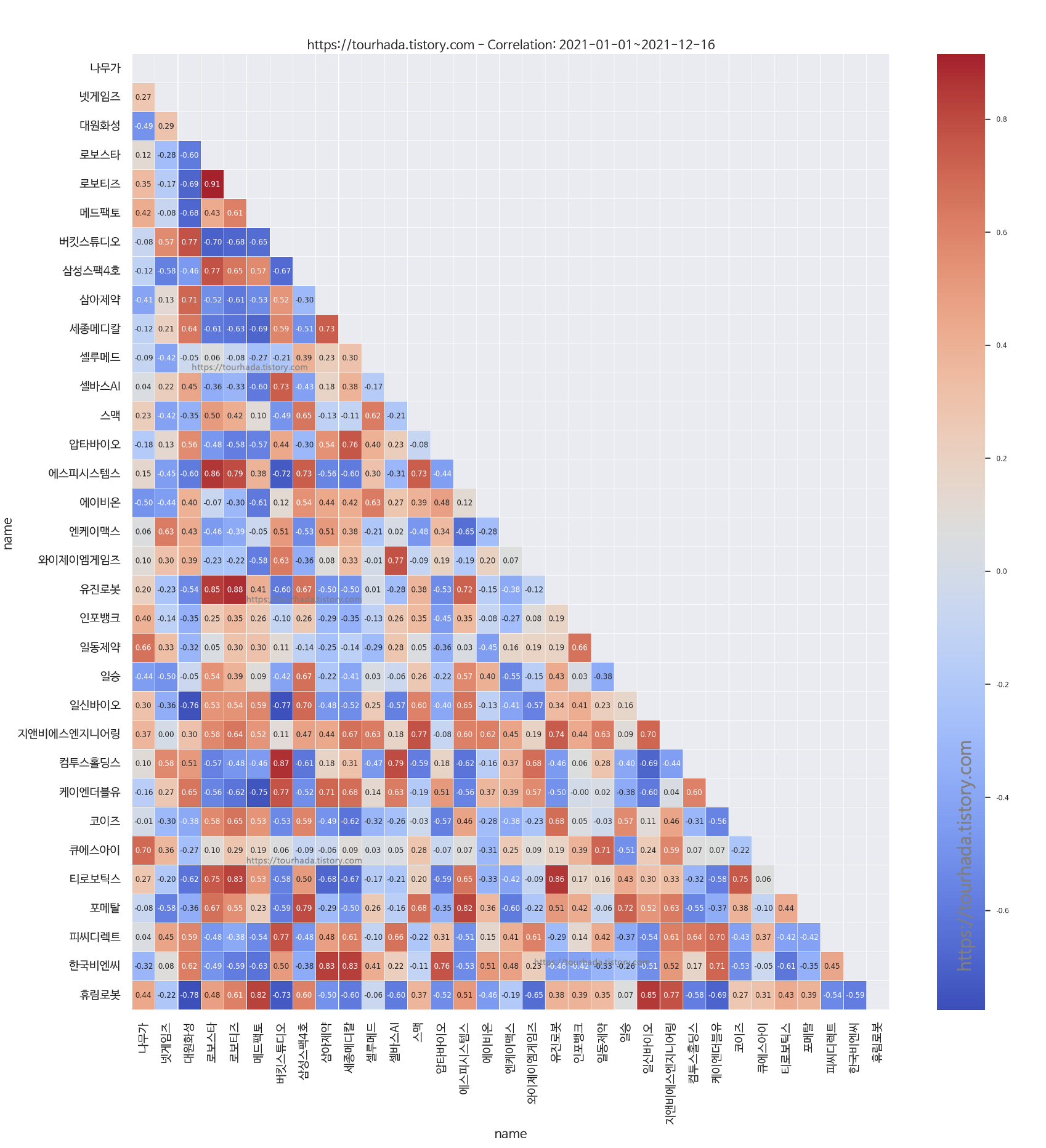 그림 3. KOSPI와 KOSDAQ 종목 추천 상관관계 분석 (2021.12.16) - 무단전재 및 재배포 금지