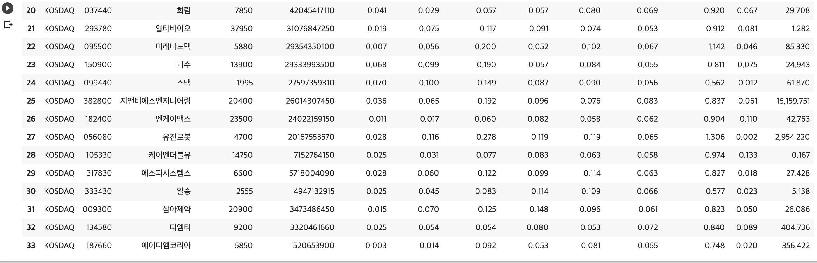 | KOSDAQ | 293780 | 압타바이오 | 37950 | 31076847250 | 0.019 | 0.075 | 0.117 | 0.091 | 0.074 | 0.053 | 0.912 | 0.081 | 1.282 |
