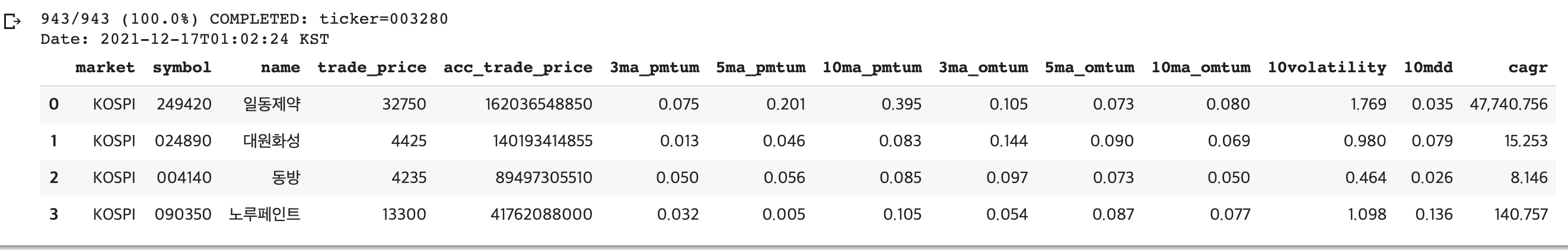 앞서 차트 분석을 통한 변동성과 모멘텀 전략으로 그래프가 우상향 하는 종목들만 랭킹을 뽑아서 거래대금과 연간환산수익률(CAGR) 이 높은 기준들로 주식은 KRX에 등록된 KOSPI 943개(2021년 12월 16일 기준)와 KOSDAQ 1533개(2021년 12월 16일기준), 코인은 업비트(upbit)에 상장된 109개(2021년 12월 16일 기준)중에서 추천 목록을 자동으로 데이터 모델링을 해보았다.