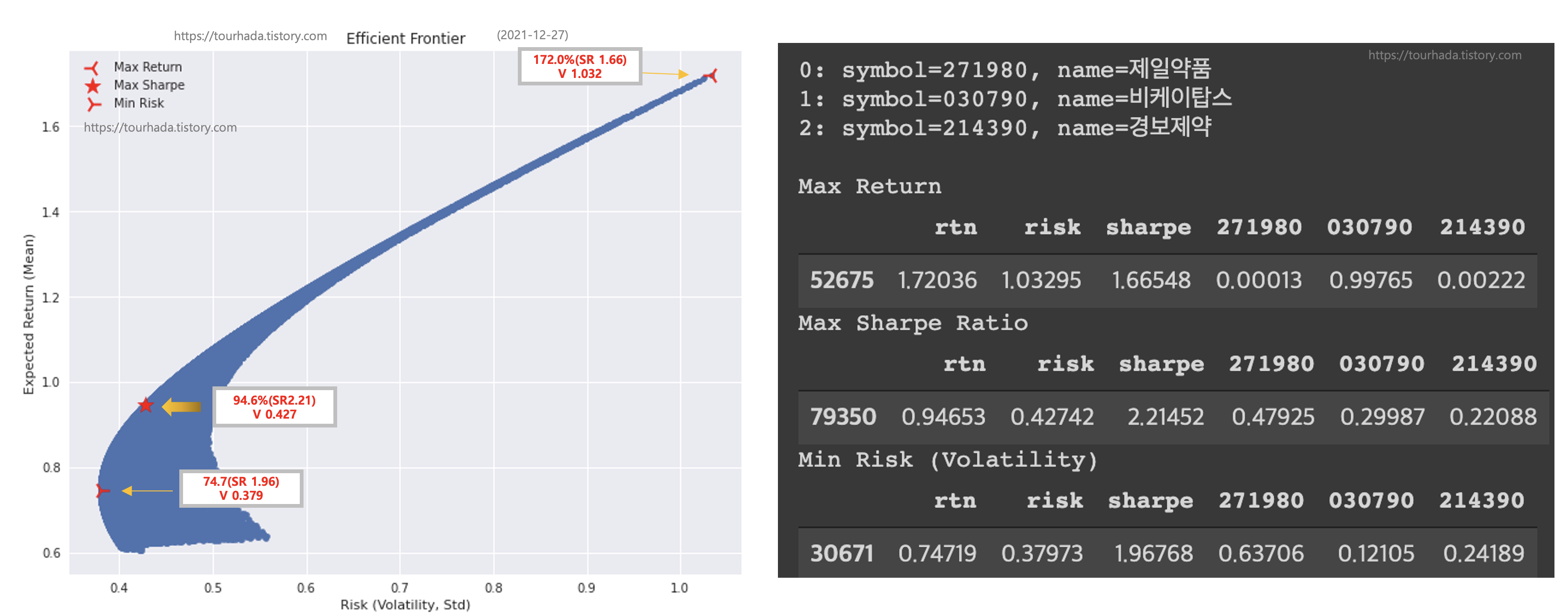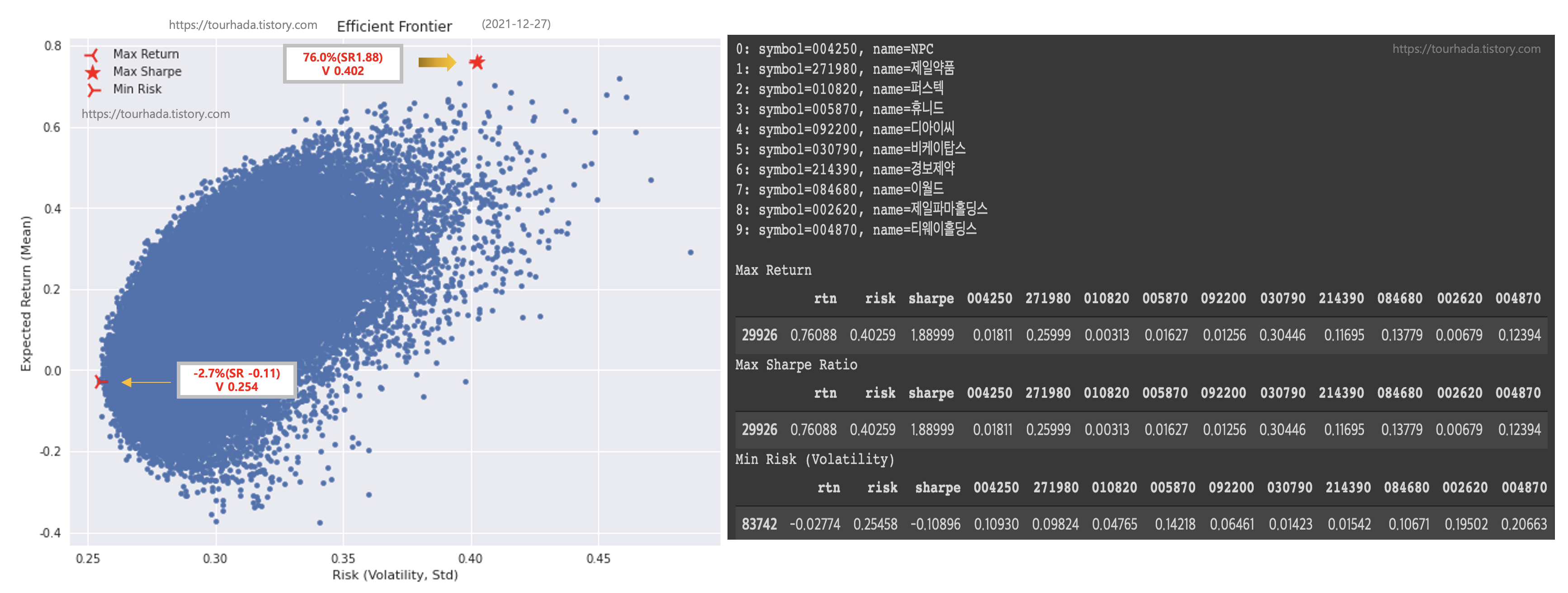 Efficient Frontier 포트폴리오 분석에서 높을 비중을 나타내는 5 종목에 대하여 분석한 자료을 참조해보면, 수익률을 극대화 했을때는 지나인제약(078650)이 92.2% 비중으로 한종목에 집중 투자했을때  최고166.1 %수익률이 나는것으로 시뮬레이션 되었다