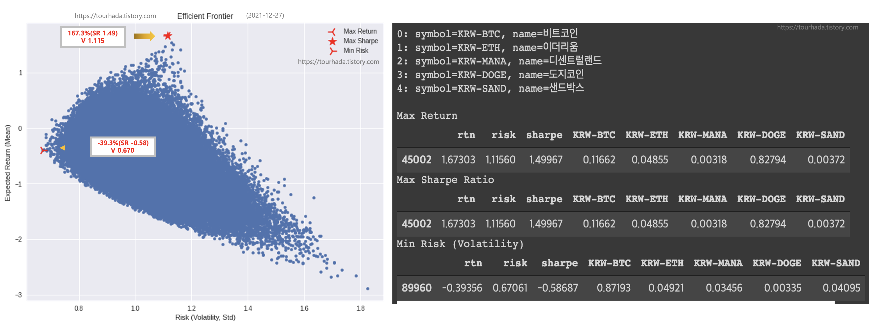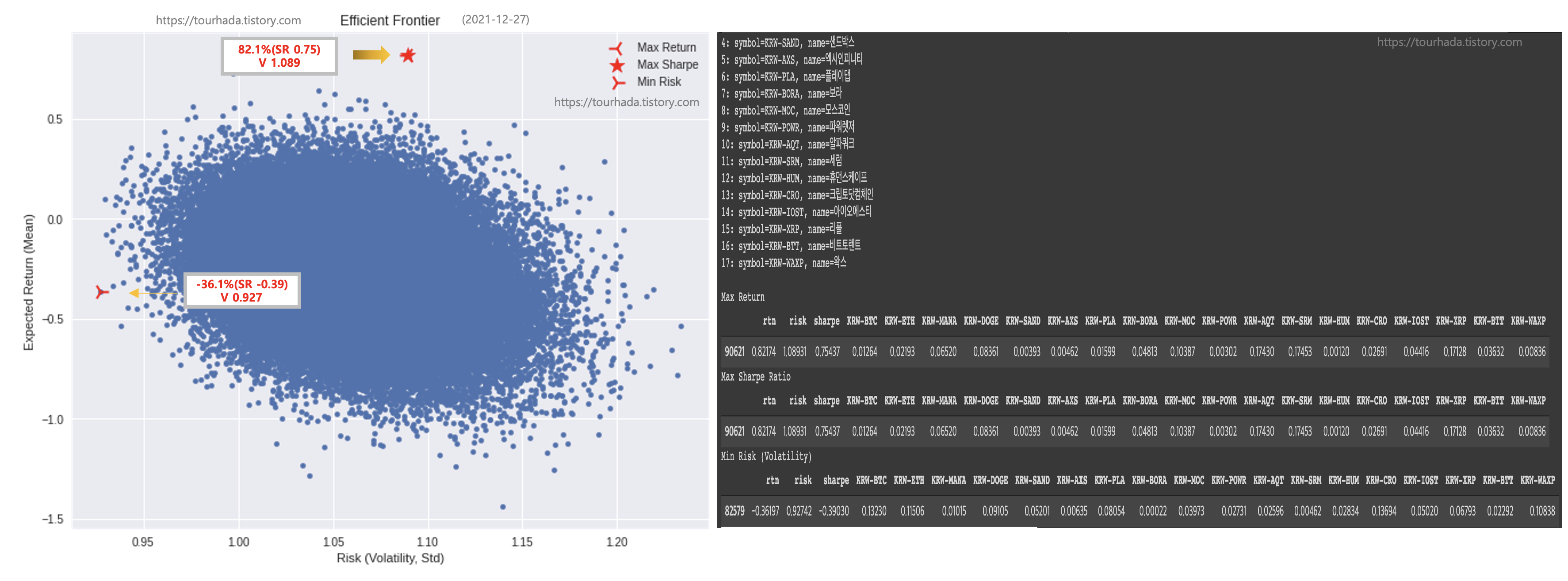 코인 종목들에 대한 효율적 투자선(Efficient Frontier Portfolio)를 위한 몬테카를로 시뮬레이션으로  랜덤 포트폴리오를 구성해 보았다.