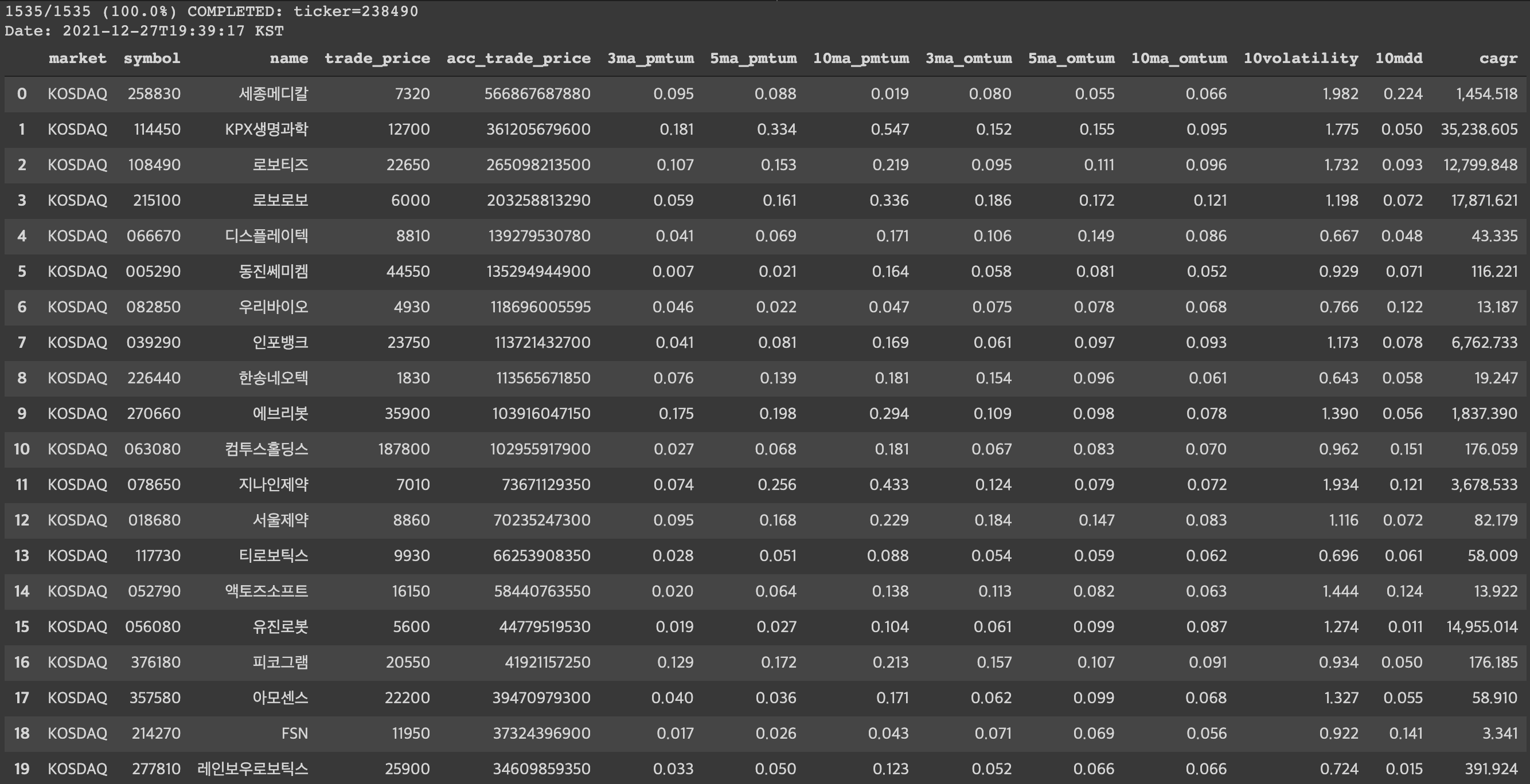 앞서 차트 분석을 통한 변동성과 모멘텀 전략으로 그래프가 우상향 하는 종목들만 랭킹을 뽑아서 거래대금과 연간환산수익률(CAGR) 이 높은 기준들로 주식은 KRX에 등록된 KOSPI 943개(2021년 12월 27일 기준)와 KOSDAQ 1535개(2021년 12월 27일기준), 코인은 업비트(upbit)에 상장된 109개(2021년 12월 27일 기준)중에서 추천 목록을 자동으로 데이터 모델링을 해보았다.