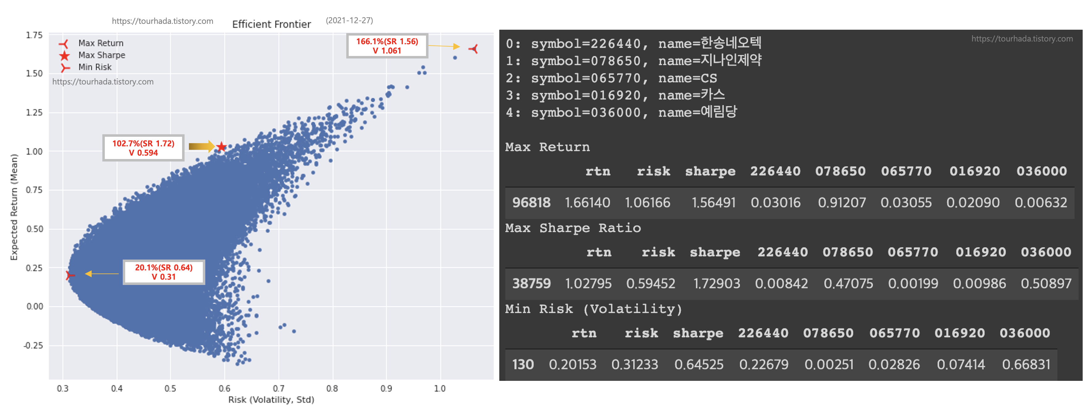 전체 종목에 중에서 거래대금이 높고 많이 알려진 종목 5개만 추려서 다시 포트폴리오 구성을 위해 효율적투자선 구성을 해보았다.