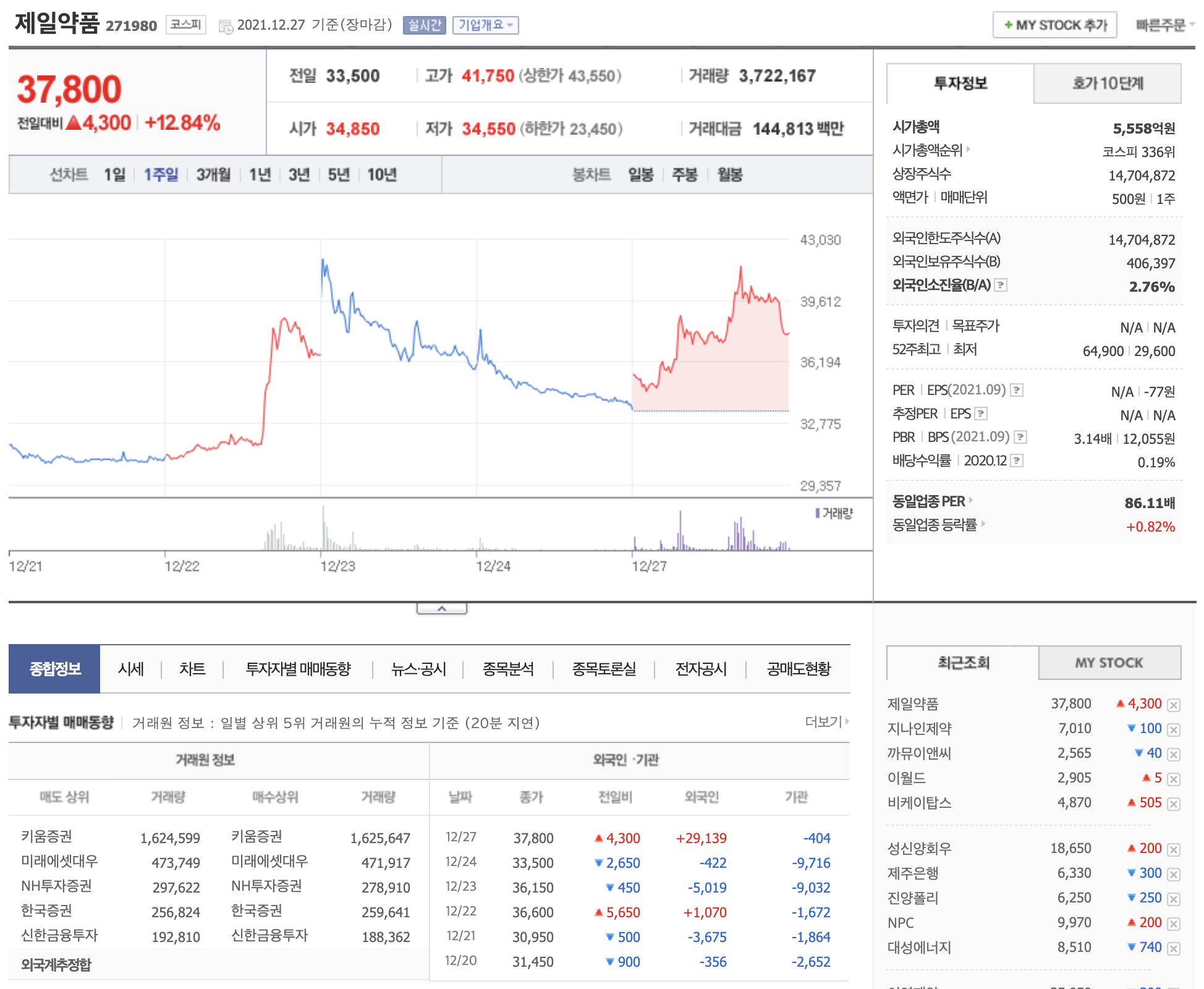 포트폴리오에서 샤프비율(sharpe ratio, 리스크프리미업 대비 수익률이 가장 좋은 비율)에서는 최고 수익률이 94. 6% 시뮬레이션 되었고,제일약품이 가장 높은 비중(47.9%)으로 구성을 추천되어서, 이 종목의 1주일, 3개월 간의 주식 시세 차트 변화를 살펴보았다.
