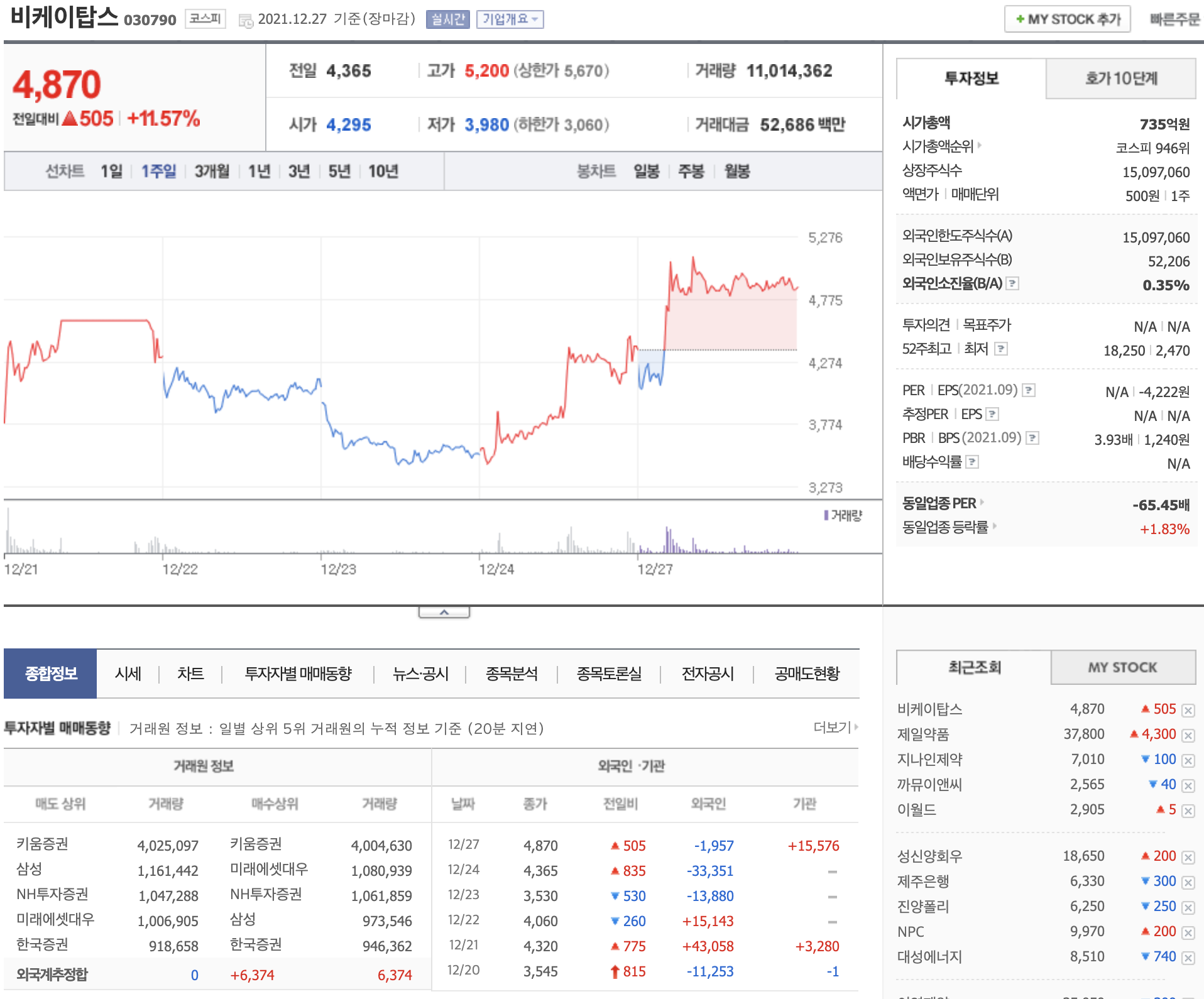 포트폴리오에서 샤프비율(sharpe ratio, 리스크프리미업 대비 수익률이 가장 좋은 비율) 에서  두번째로  비중(29.9%)이 높은 구성을 추천 했던 베케이탑스 종목의 1주일, 3개월 간의 주식 시세 차트 변화이다.