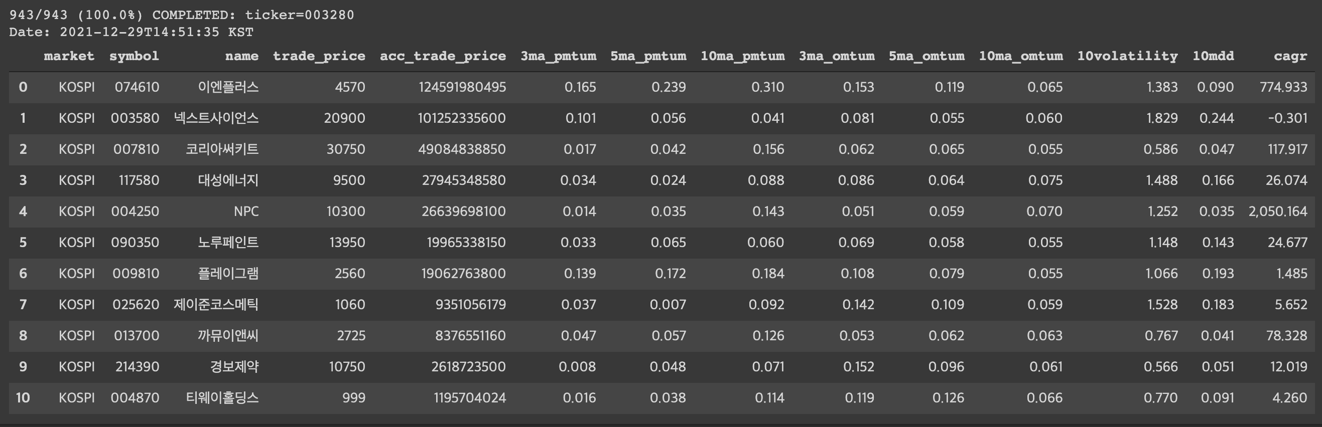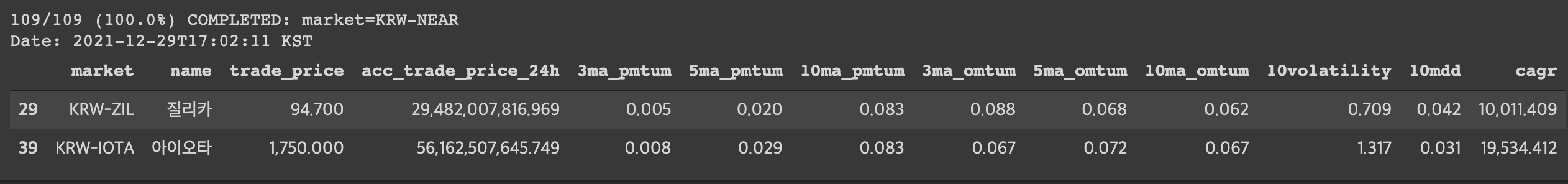 앞서 차트 분석을 통한 변동성과 모멘텀 전략으로 그래프가 우상향 하는 종목들만 랭킹을 뽑아서 거래대금과 연간환산수익률(CAGR) 이 높은 기준들로 주식은 KRX에 등록된 KOSPI 943개(2021년 12월 28일 기준)와 KOSDAQ 1535개(2021년 12월 28일기준), 코인은 업비트(upbit)에 상장된 109개(2021년 12월 28일 기준)중에서 추천 목록을 자동으로 데이터 모델링을 해보았다.