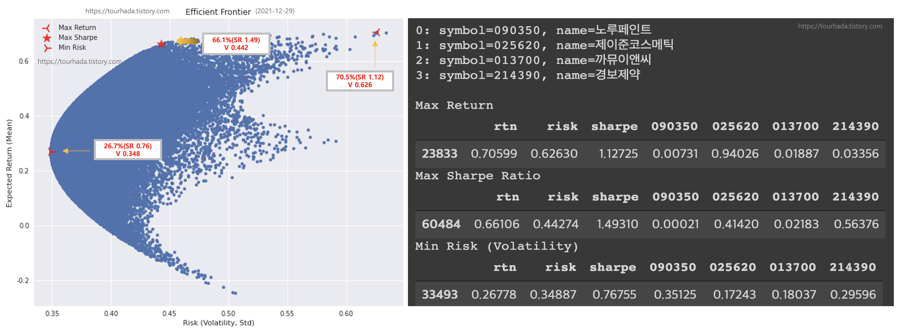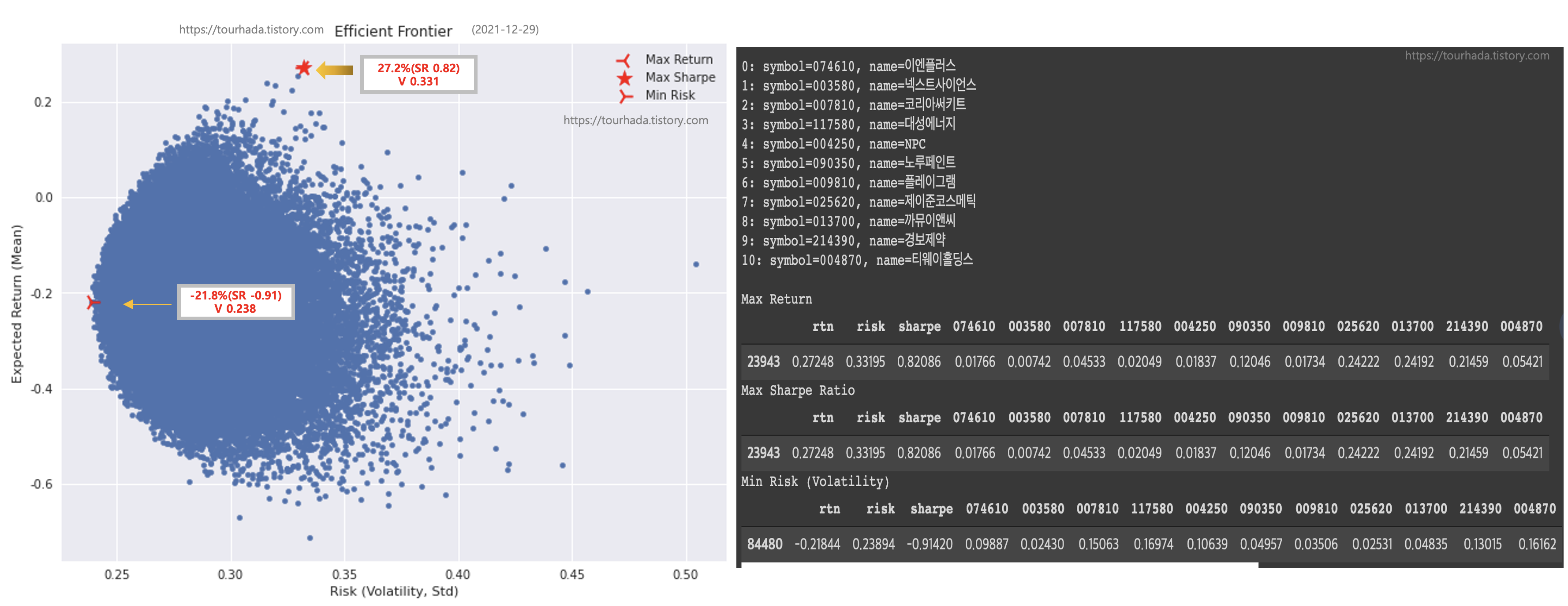 이전 날짜에서 부터 데이터 분석한 자료들을 토대로 비교해보자면 랜덤 시뮬레이션에 의한 포트폴리오에서 최고 수익률이 27.2%는 굉장치 낮은 수치값에 해당한다.