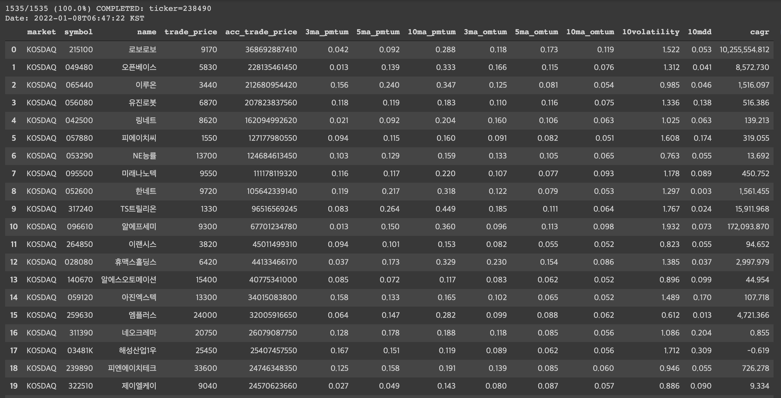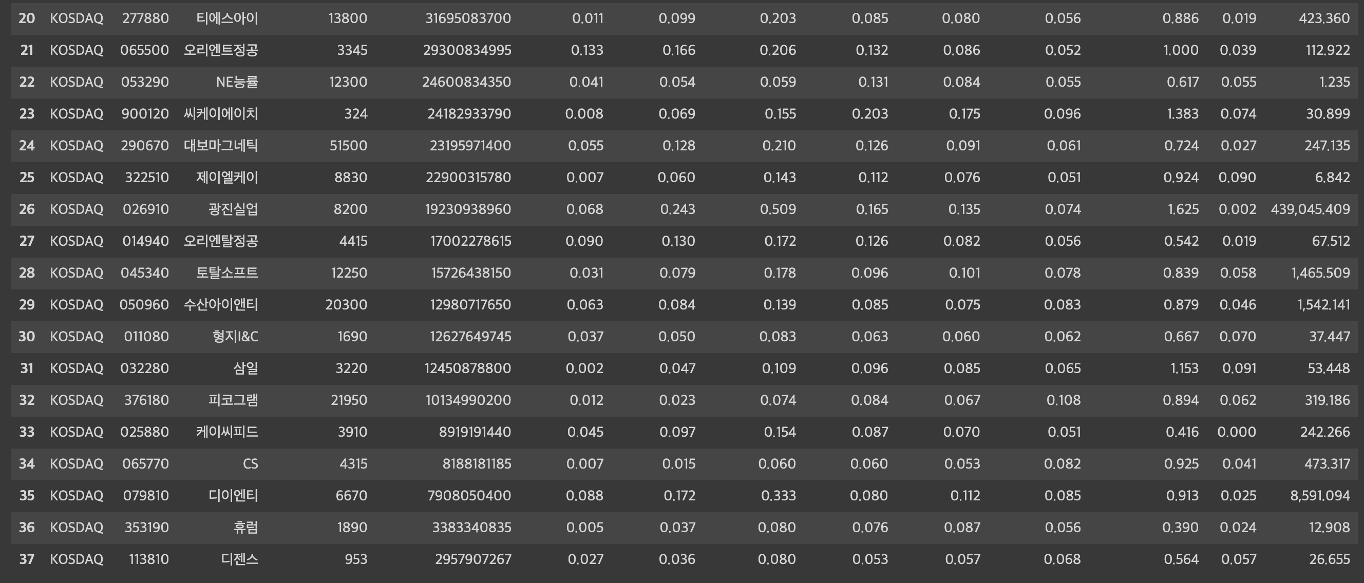 | KOSDAQ | 376180 | 피코그램 | 21950 | 10134990200 | 0.012 | 0.023 | 0.074 | 0.084 | 0.067 | 0.108 | 0.894 | 0.062 | 319.186 |