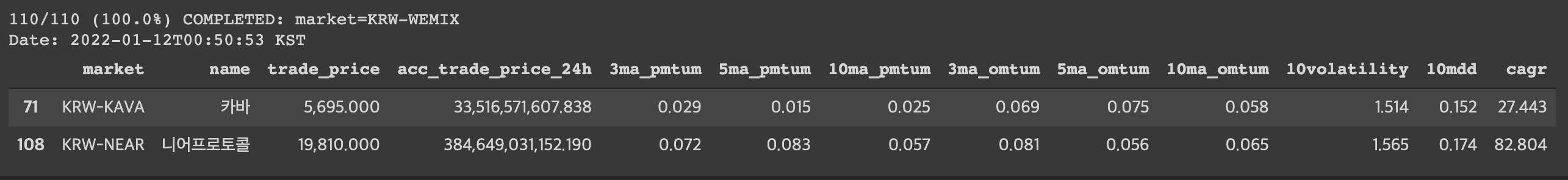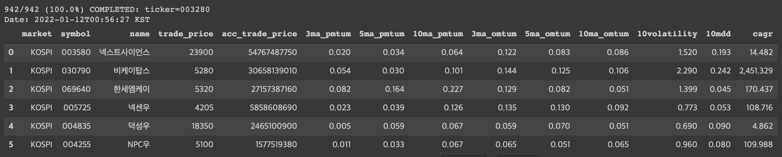 앞서 차트 분석을 통한 변동성과 모멘텀 전략으로 그래프가 우상향 하는 종목들만 랭킹을 뽑아서 거래대금과 연간환산수익률(CAGR) 이 높은 기준들로 분석했다.  실시간 거래 정보들은 주식은 KRX에 등록된 KOSPI 942개(2022년 1월 11일 기준)와  KOSDAQ 1535개(2021년 1월 11일기준),  코인은 업비트(upbit)에 상장된 110개(2022년 1월 11일 기준 위믹스(WEMIX) 신규상장 )중에서 분석 기준시점에 추천 목록을 자동으로 데이터 모델링을 해보았다.