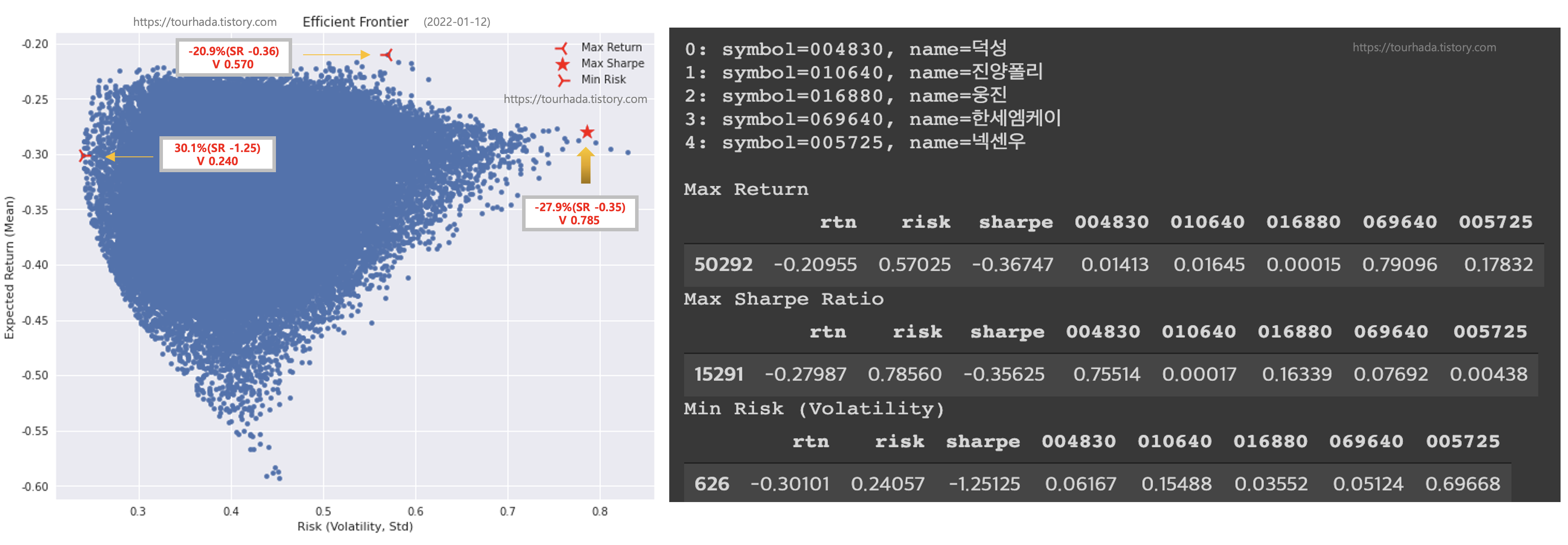 Efficient Frontier Portfolio 를 위한 포트폴리오를 여러번 돌려봤지만, 모두 최고 수익률이 마이너스 값으로 투자 손실을 대략 -20% 이상 날 수 있다는 시뮬레이션 결과가 나왔다.